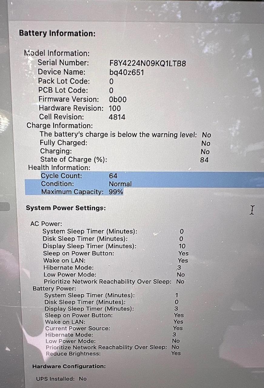 Battery health is excellent - only 64 cycles, 99% capacity, condition “Normal.” Serial number DH9CFQHG23.