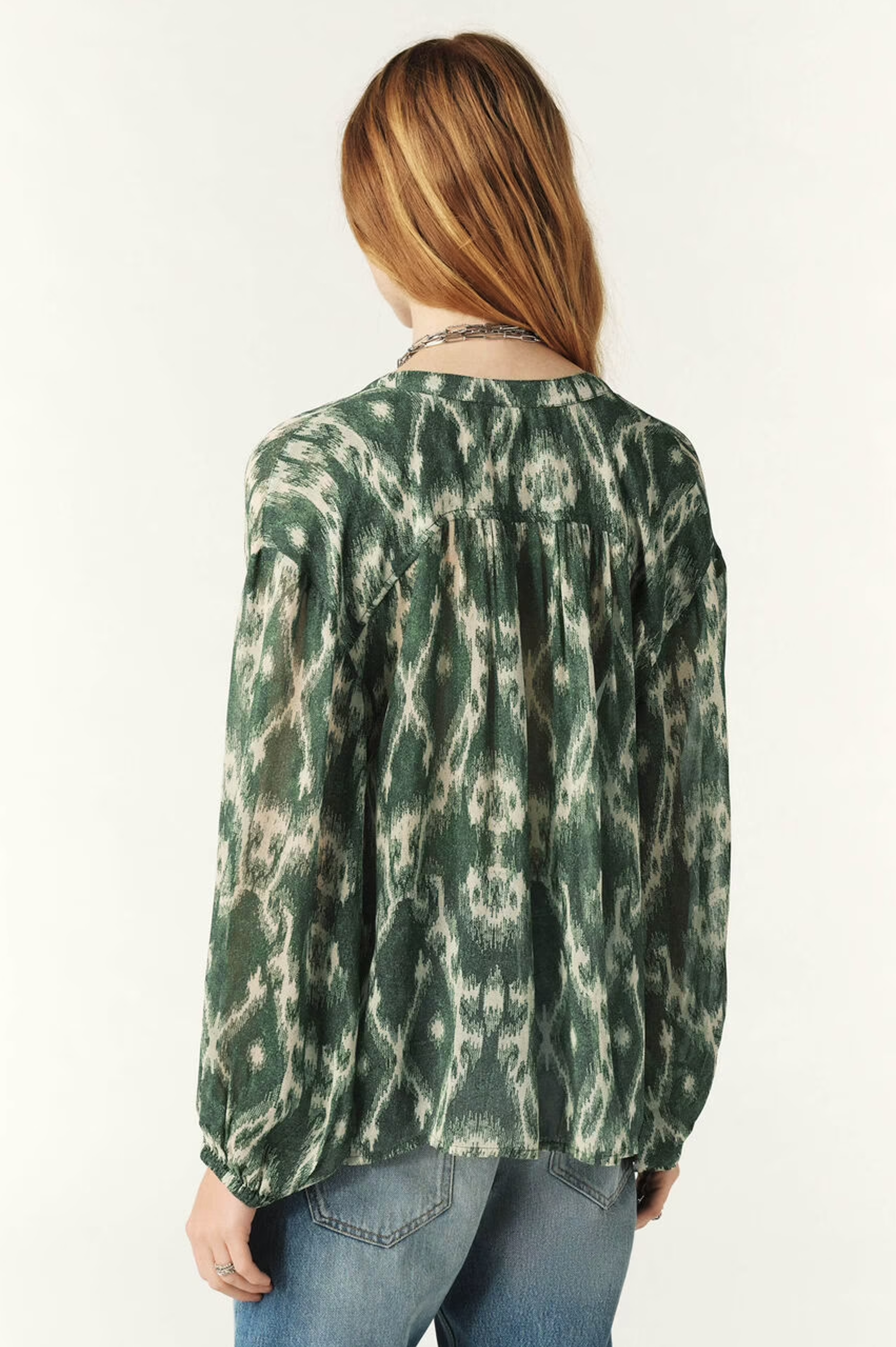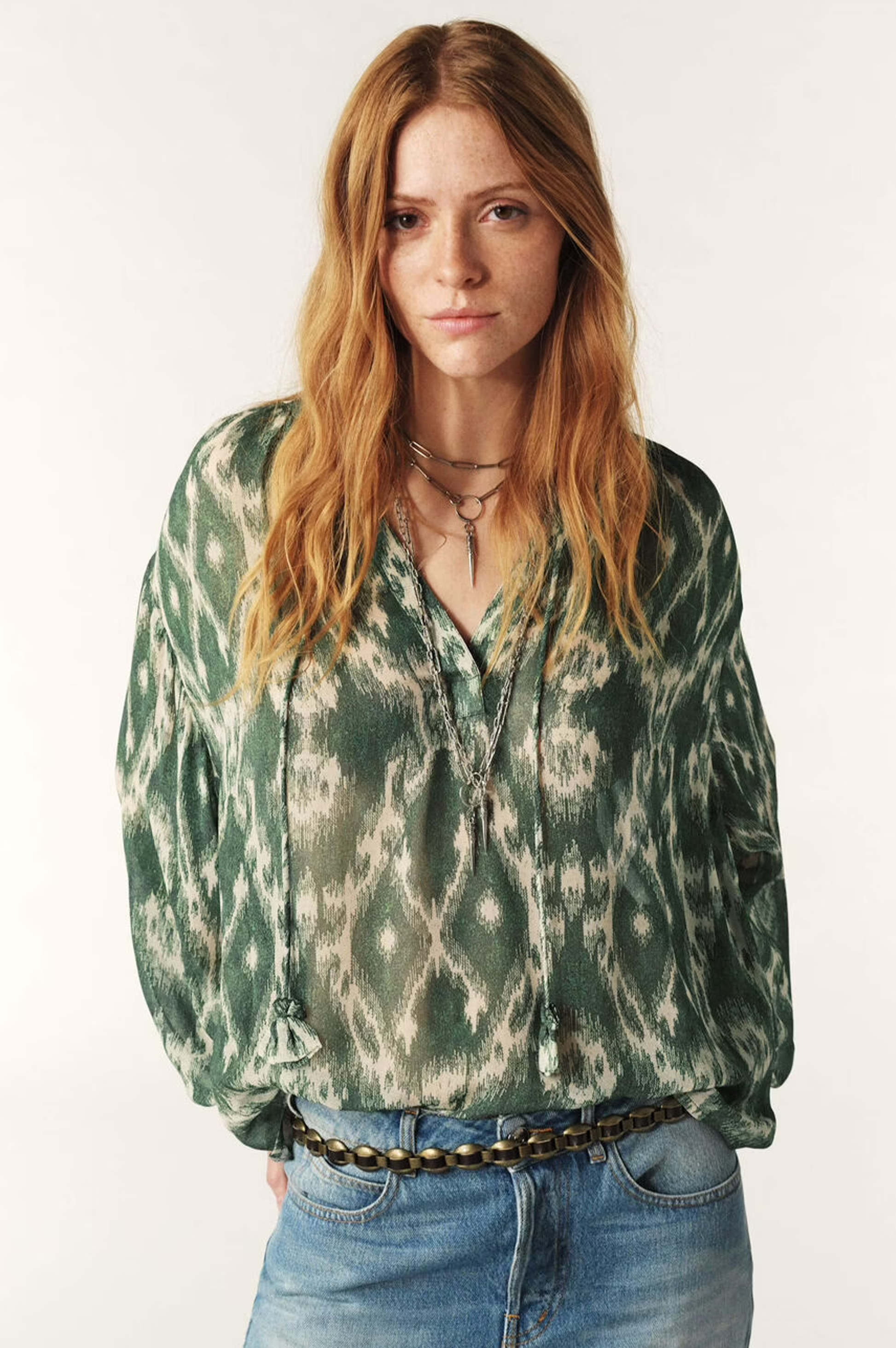 Effortlessly chic and versatile, the Ba&sh Menaelle Khaki Blouse is a must-have addition to any wardrobe. With its sheer v neck design, this blouse is both feminine and trendy. Perfect for day or night, it's the ideal piece to elevate any outfit.