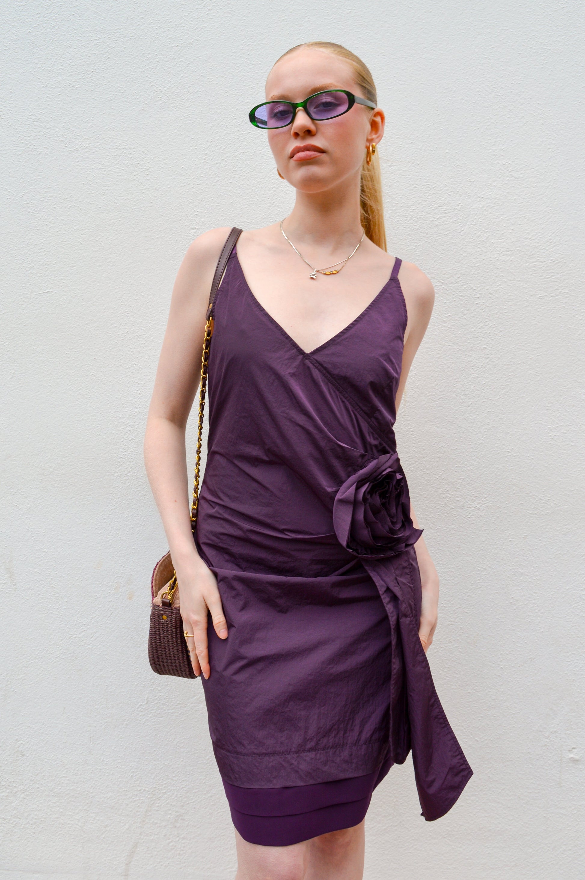 This stunning dress features a wrap style v-neck with elasticated straps for comfort and fit. A rose style patch sits on the waist adding to the flattering slightly pinched effect of the dress, with a short length skirt. The dress fastens with a zip down the side.