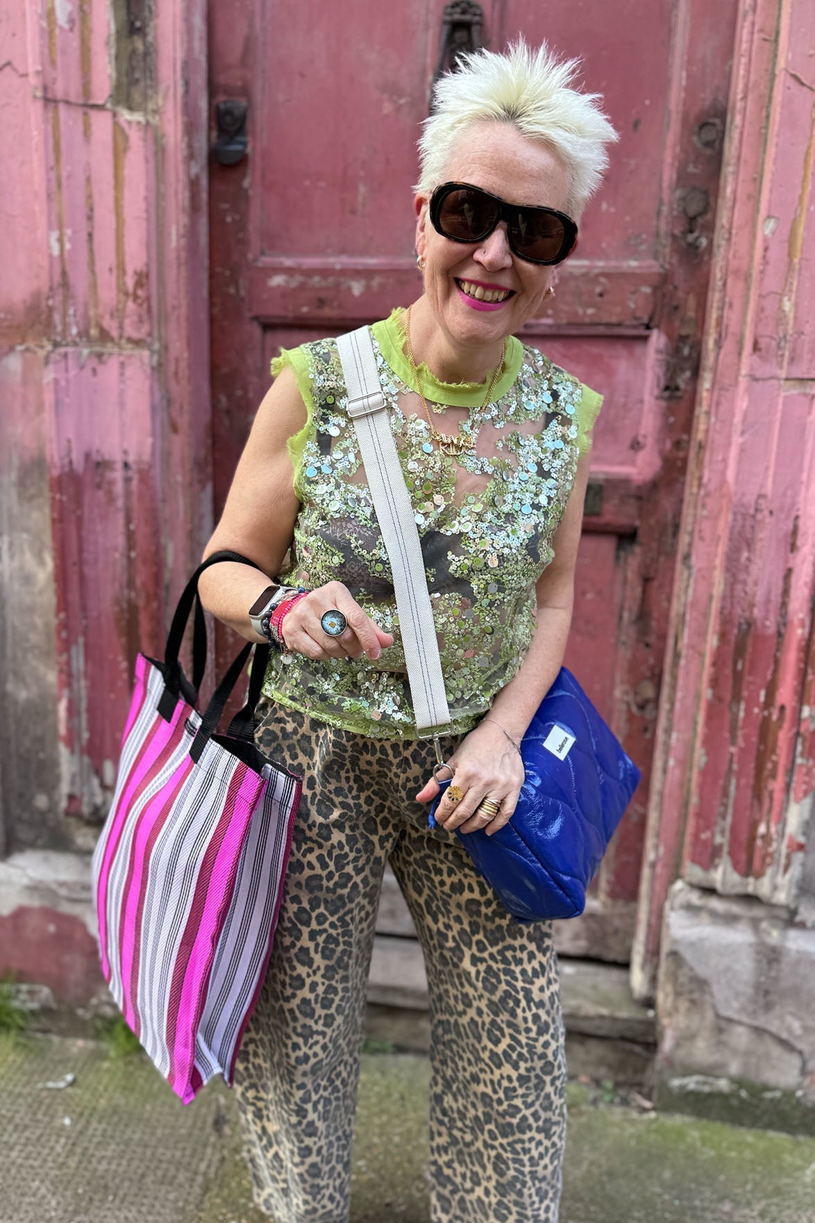 The Manira Sequin Top is a bold statement piece that blends modern edge with a hint of glamour. With its straight fit and sheer, unlined design, it offers a striking and sophisticated silhouette. Frayed edges at the neck, hem, and armholes add a raw, contemporary touch, while the button closure at the back provides a sleek finish. Style the Manira Top with high-waisted jeans and sneakers for an effortlessly elevated look, or pair it with our Shania Skirt for a glamorous night-out ensemble.