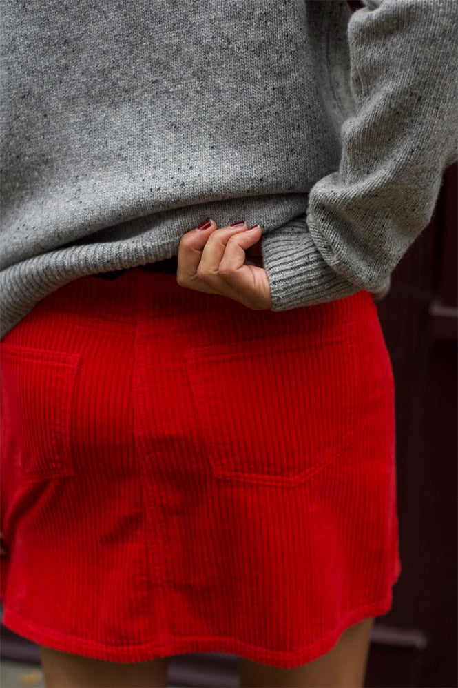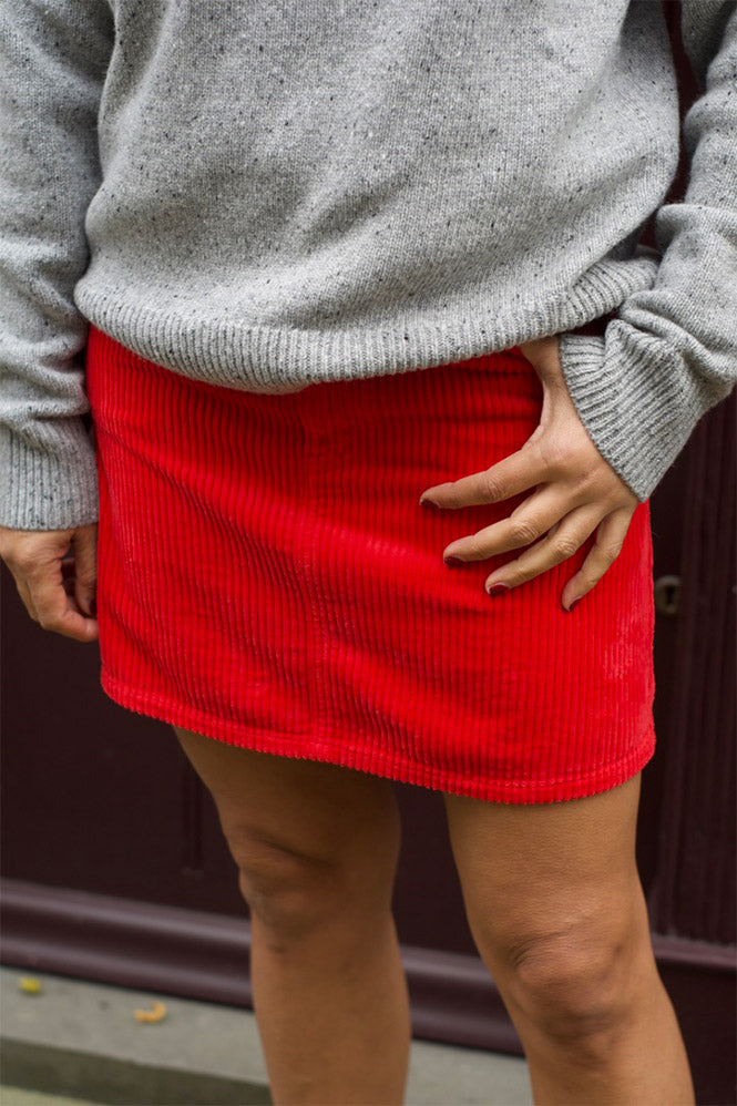 Red corduroy mini skirt with a trapeze silhouette and 5-pocket style.