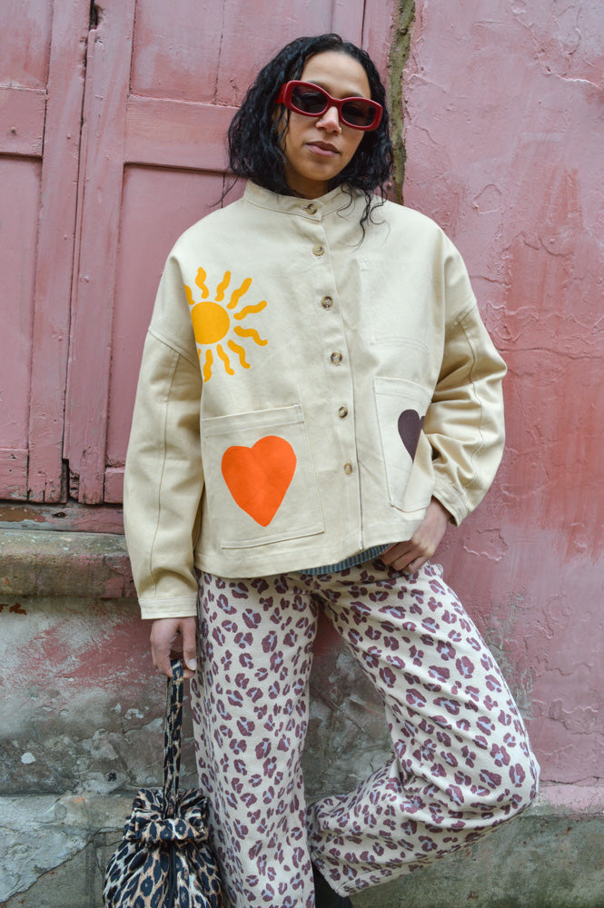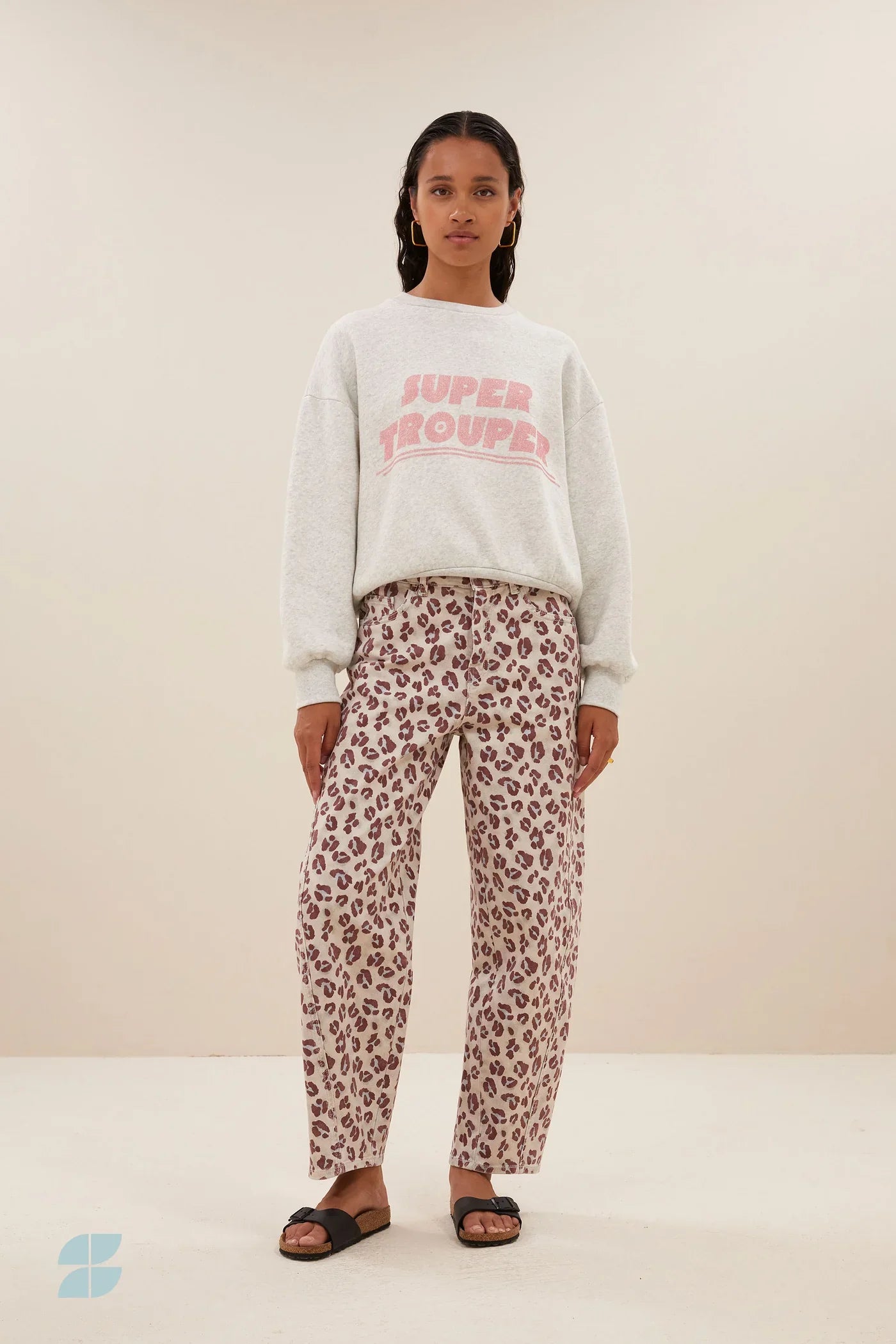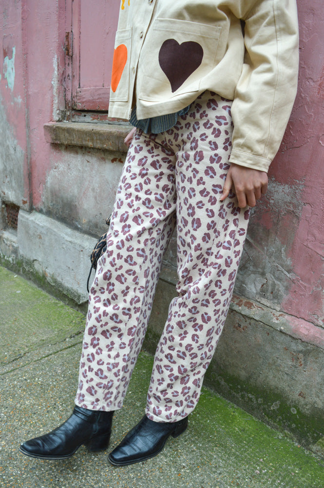 Make a statement with the begum pink cheetah pants. These striking trousers combine a pink cheetah print with classic denim fabric, creating a unique and stylish look. Designed with a normal waist and a loose fit that provides ultimate comfort.