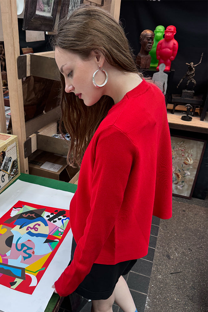 Fine and super soft fine knit jumper, with long sleeves and a flattering a-line shape. Jumper has a simple scoop neck. A great piece for layering or wearing as a top for cooler evenings or looking towards autumn starting. The perfect pop of red to add to an outfit.