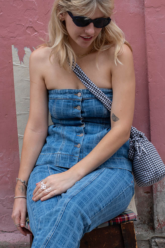 The Eloise Denim Top makes a statement in Damson's laser check print. Featuring a peplum hem, strapless neckline and front shank opening, it's the perfect top to elevate any look. Pair with the matching Tovie Jeans for a head to toe look.