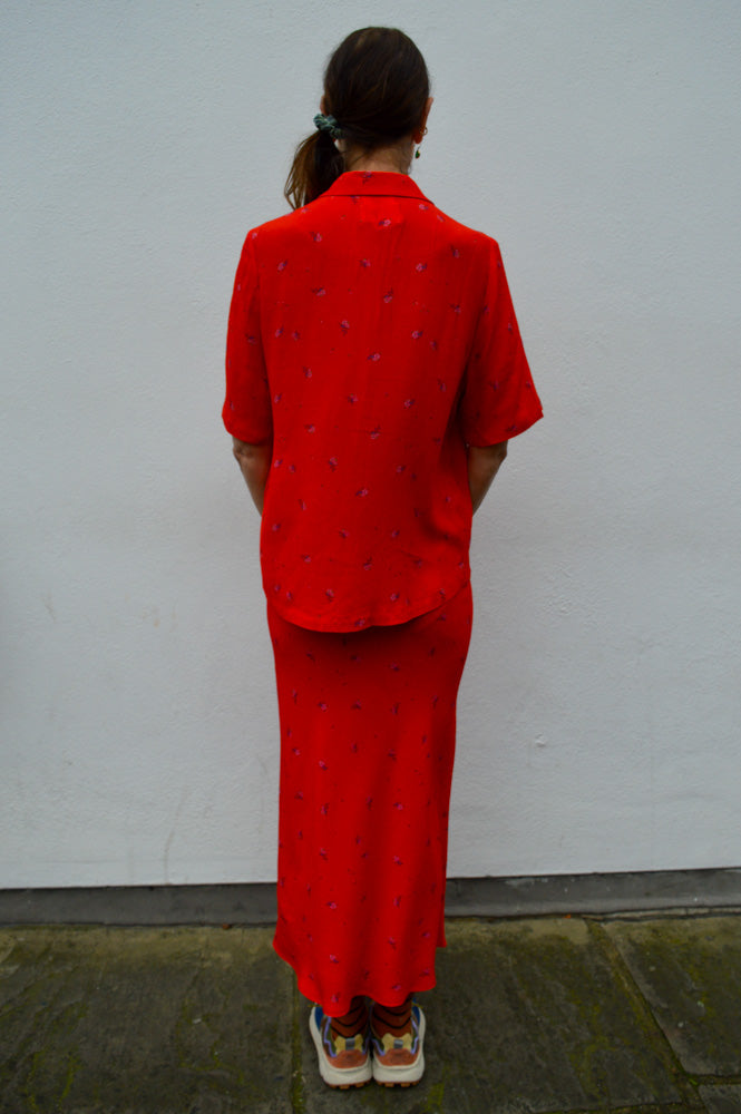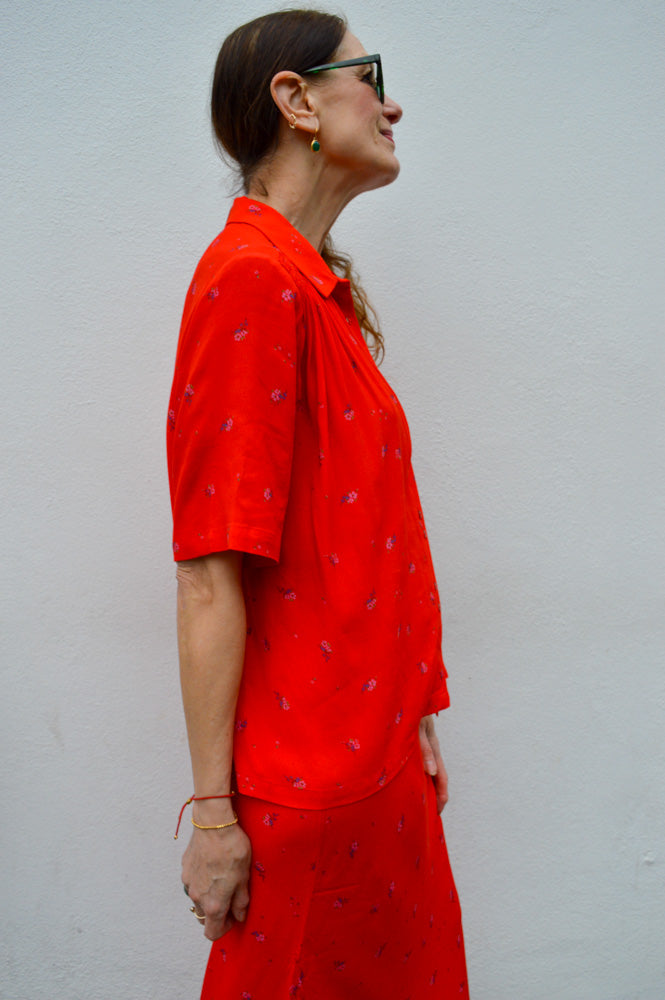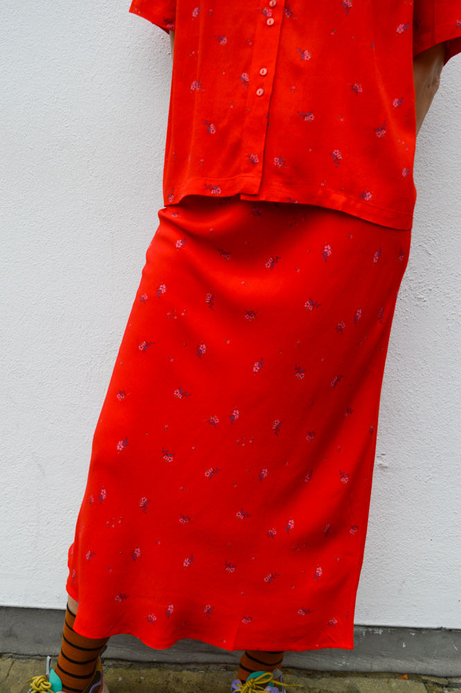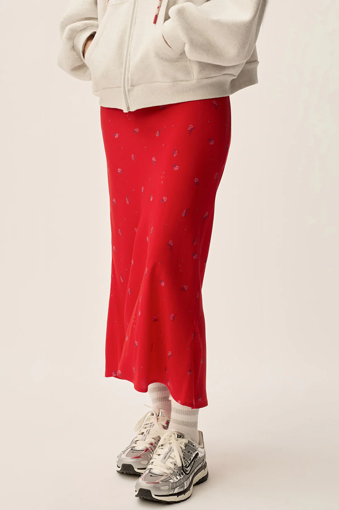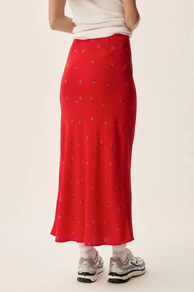 A soft and lightweight material, a vibrant color enhanced with a poetic floral pattern, the Elani skirt is worn midi length and pinched at the waist for an enhanced silhouette.