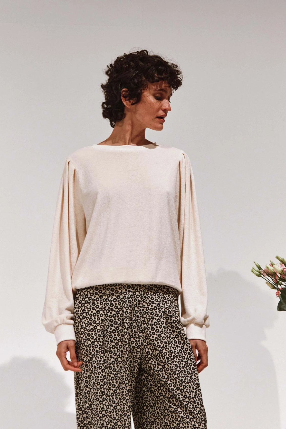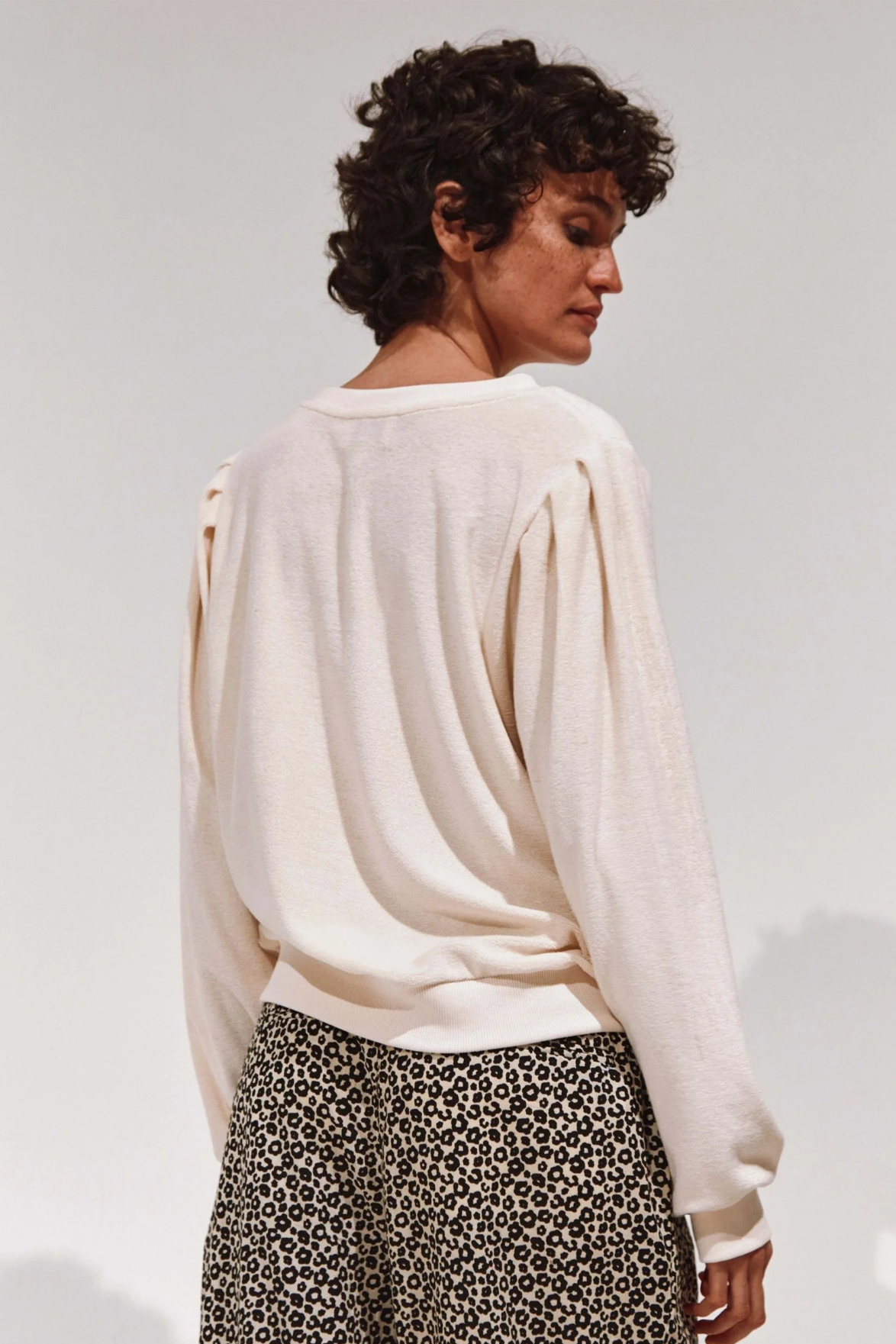 Ecru terry sweatshirt. Made from ultra-soft, fluffy, stretchy terry velvet, it offers unrivalled comfort. With tone-on-tone ribbing at the cuffs, around the neckline and at the hem, this sweatshirt has a simple yet neat cut. Recessed pleats at the top of the long sleeves add a touch of volume and whimsy, while maintaining a streamlined style.