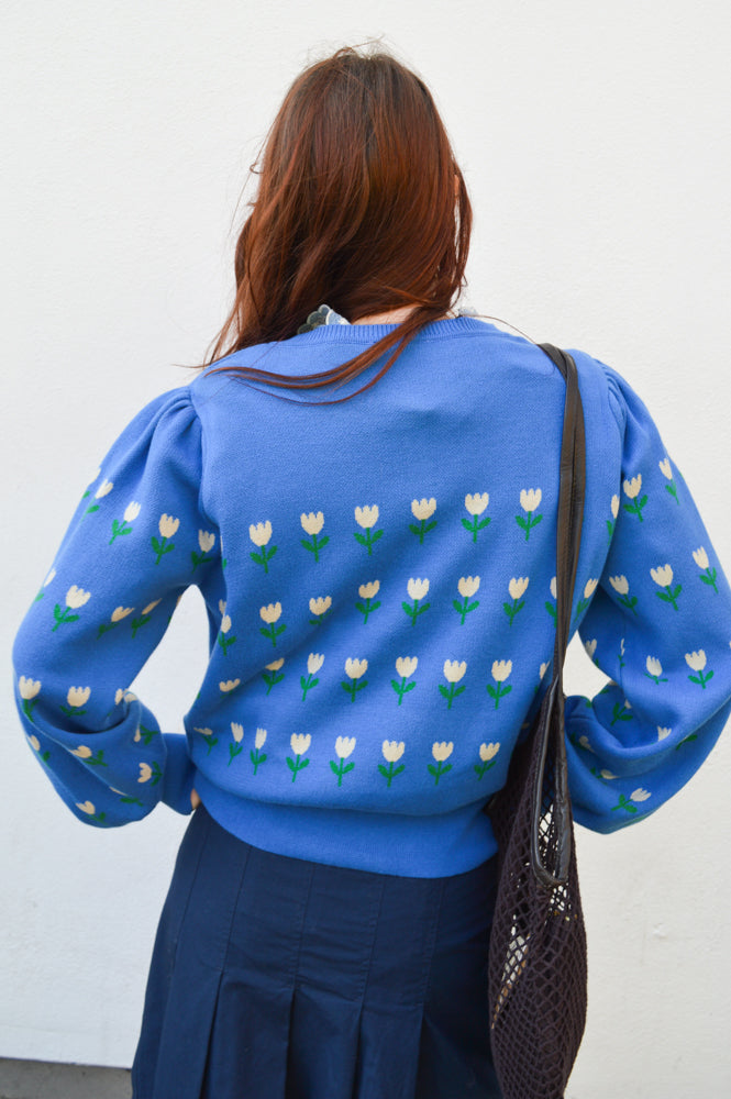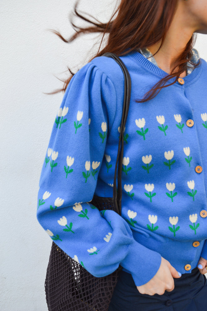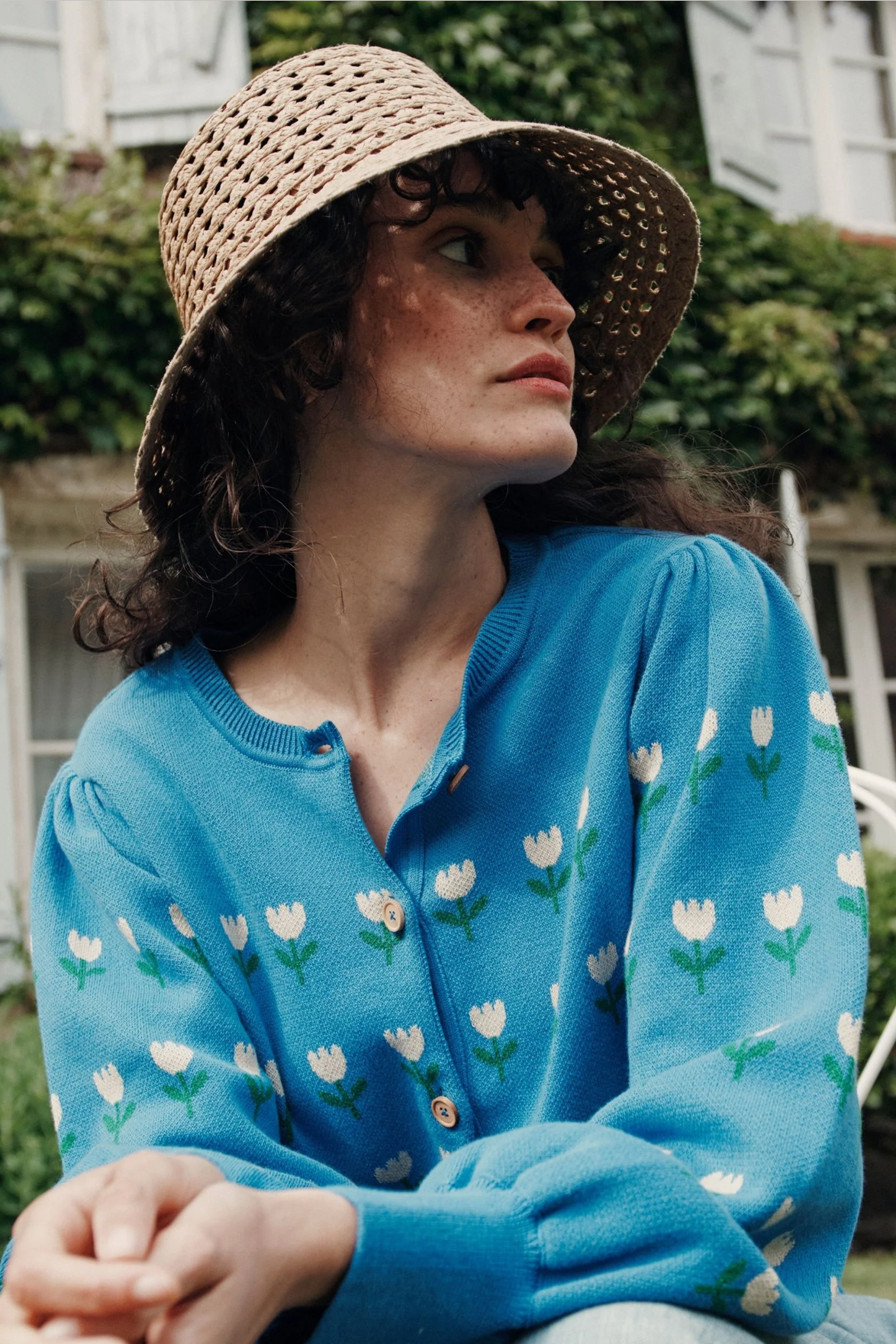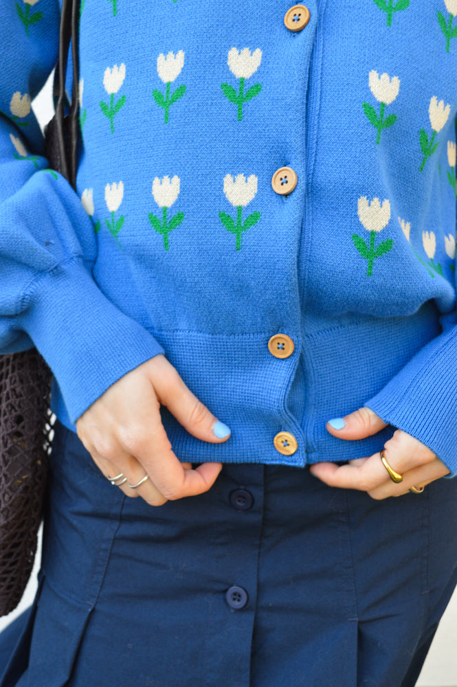 Intarsia jacquard cardigan in blue organic cotton, adorned with ecru tulips.