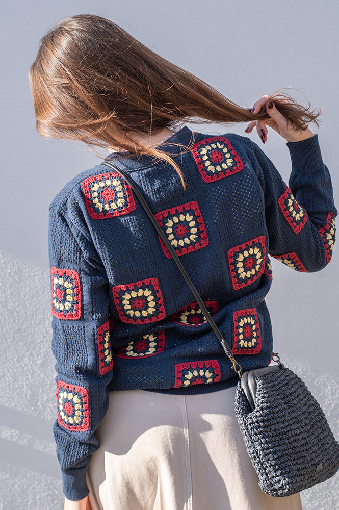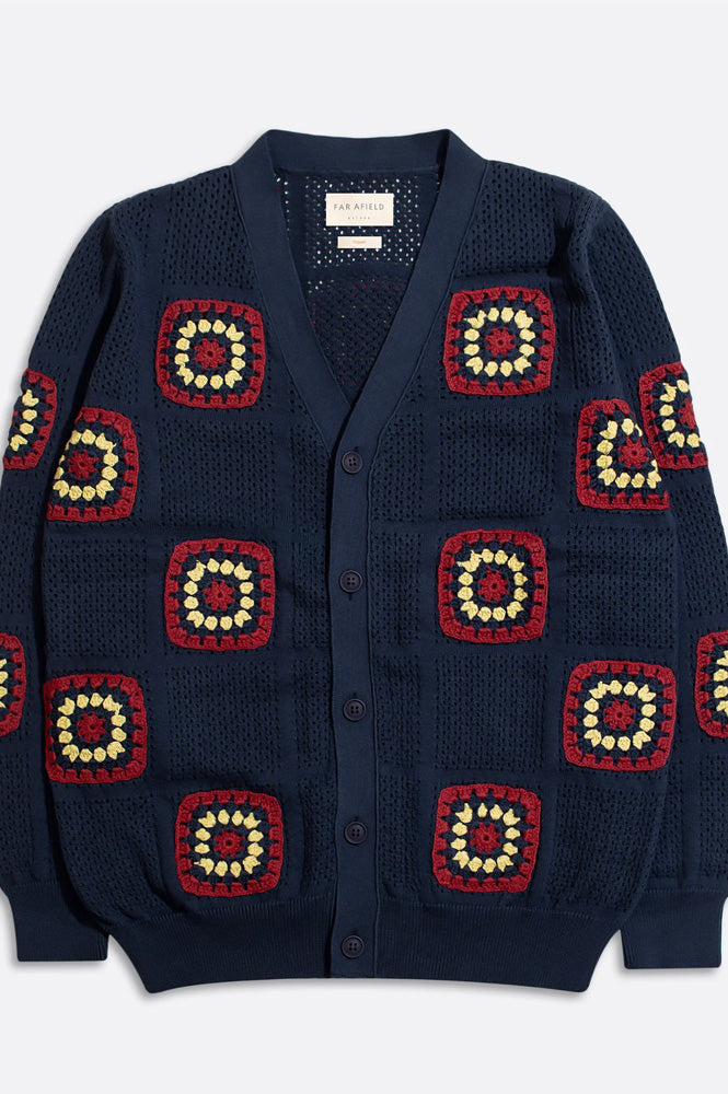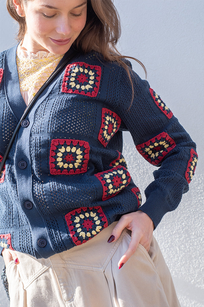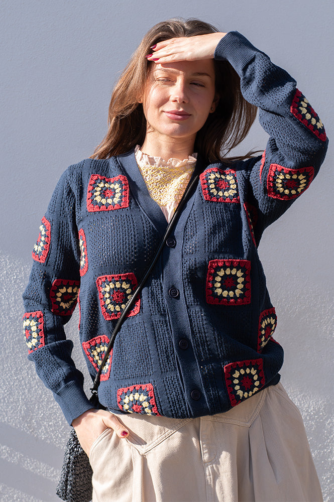 Made using the 'granny square' crochet technique, this cardigan features bold floral patterns and is crafted from soft, 100% organic cotton.