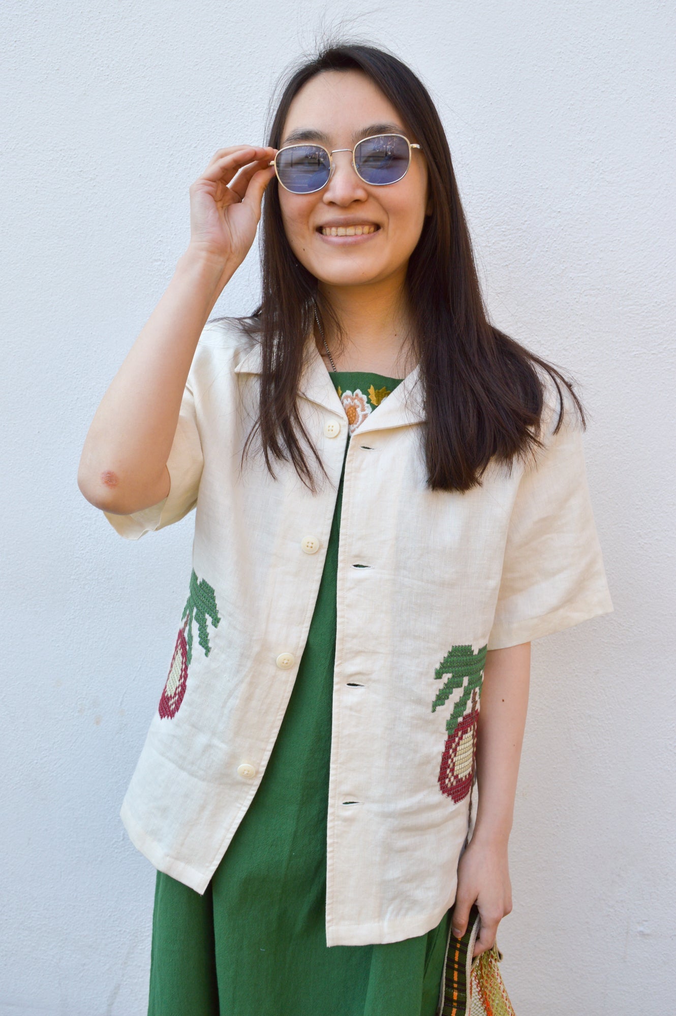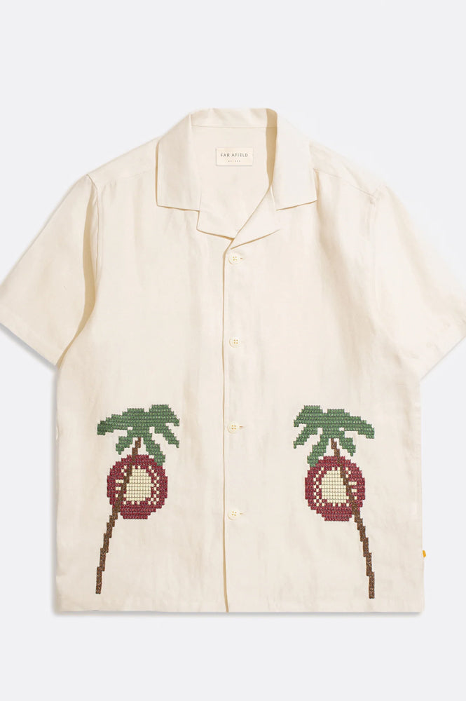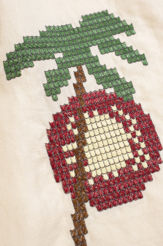 Crafted from beautifully soft, weighty linen, its minimal silhouette is punctuated by a bold sunset embroidery—an effortless piece with a defining detail.