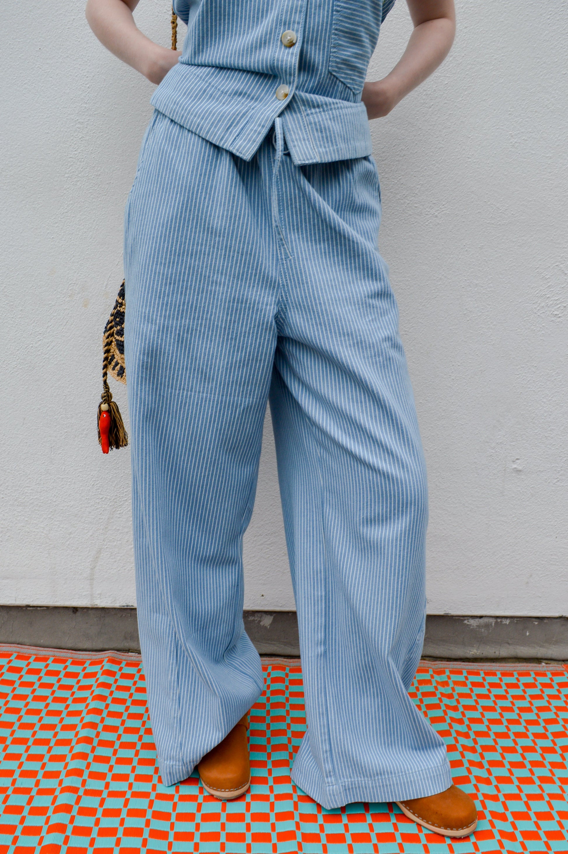 Wide, flowing cotton pants with a light pinstripe design across. These fasten comfortably with an elasticated waistband, for best fit, and a tie at the front. Soft and baggy, these trousers are a great summer wardrobe addition.