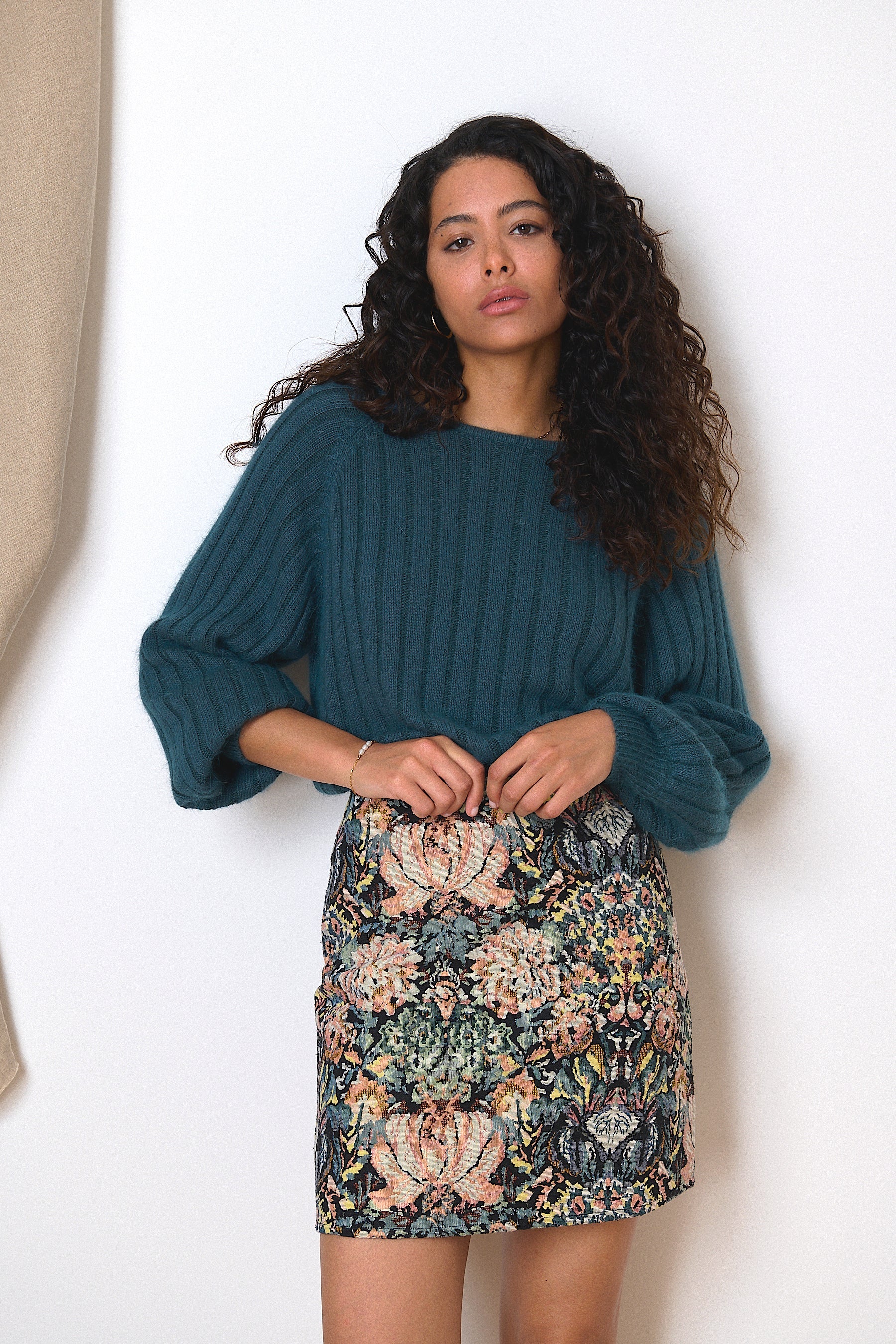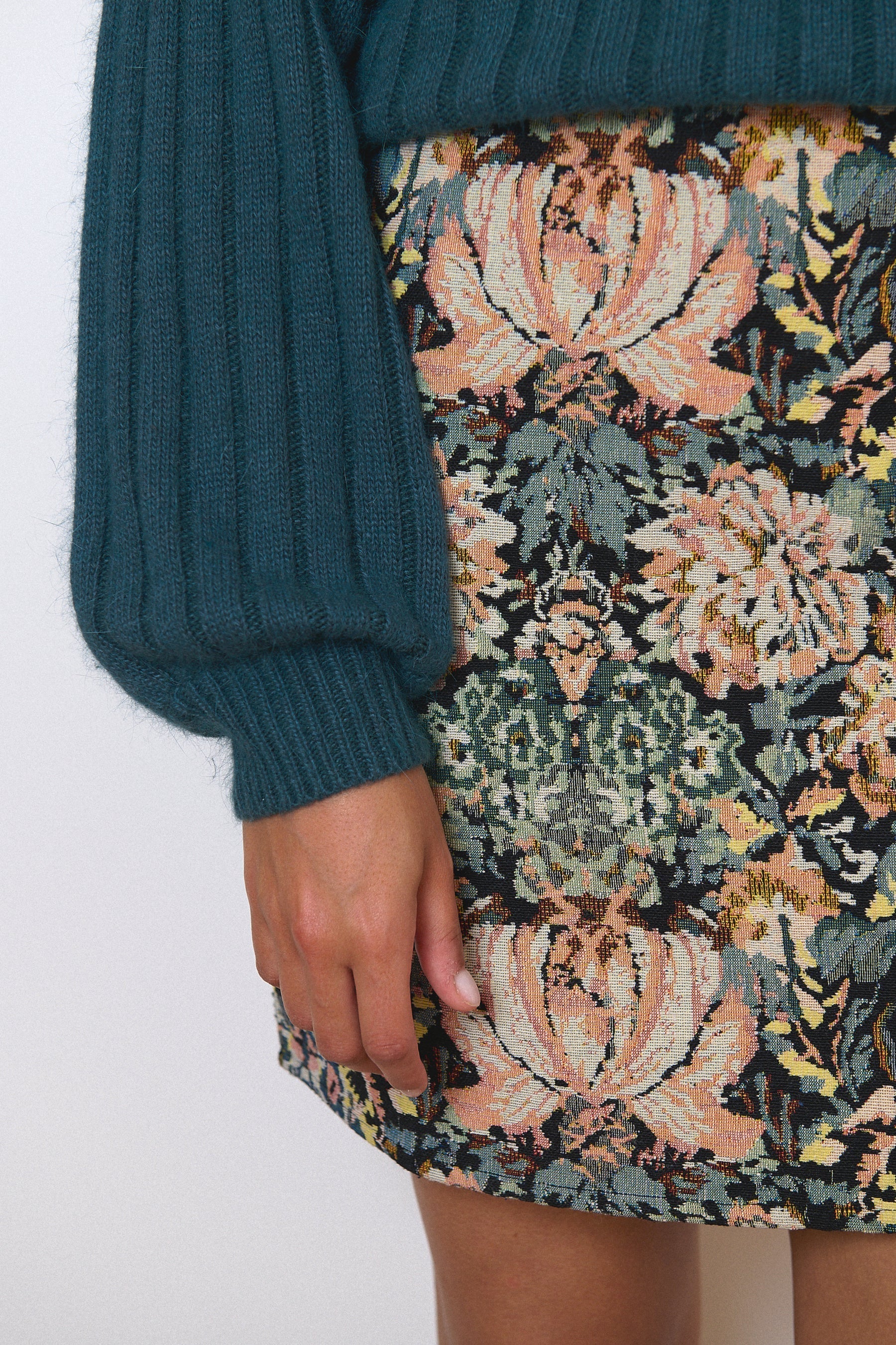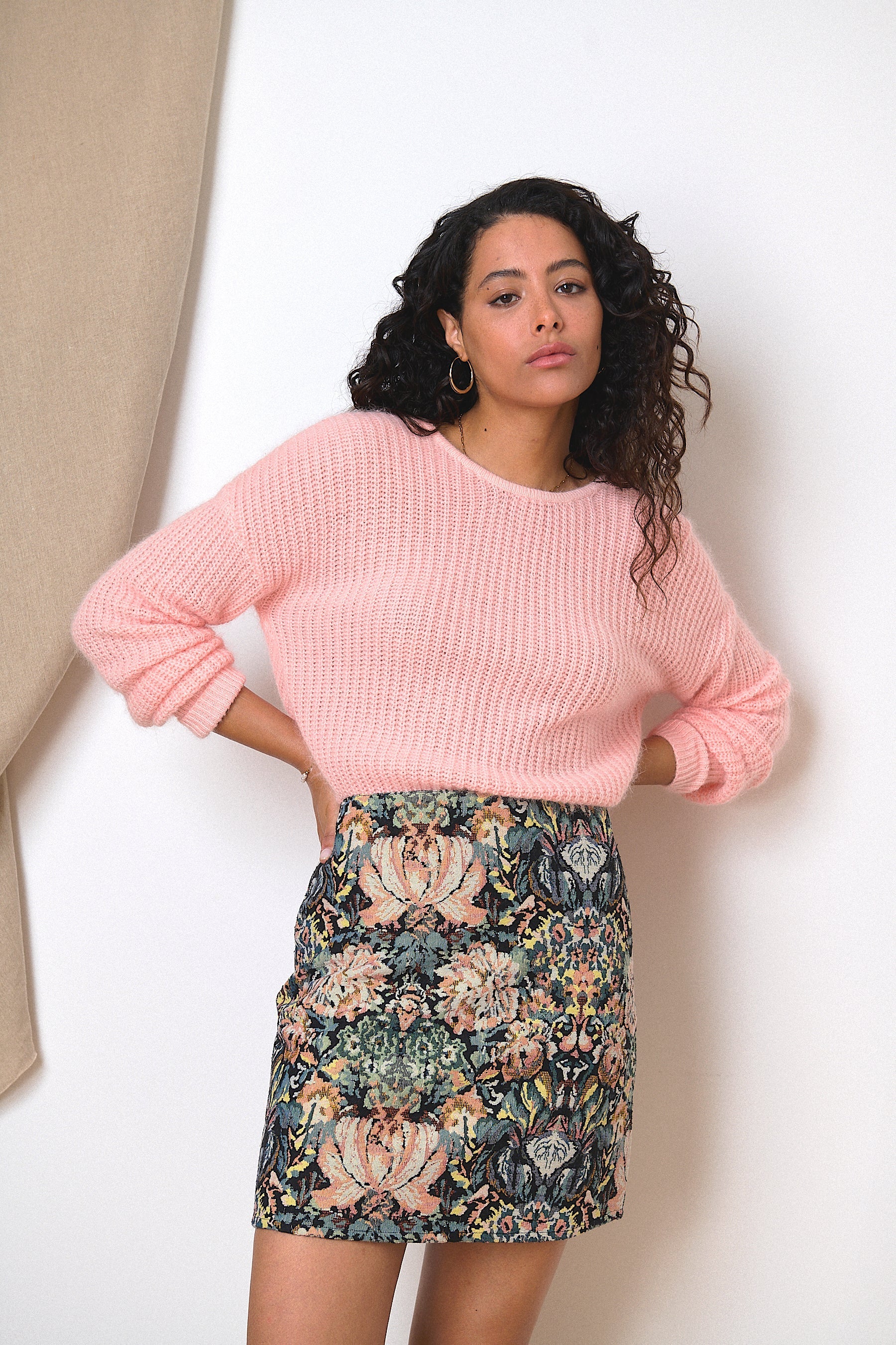 The TOKYO skirt, made from a floral jacquard fabric, has an impeccable drape. Its mini shape and high waist create a pretty silhouette that is ideal for any outing. Not to mention that its floral pattern makes it a peppy piece that can be paired with its matching jacket, a sweater in pink tones or a cardigan for an urban and original look.