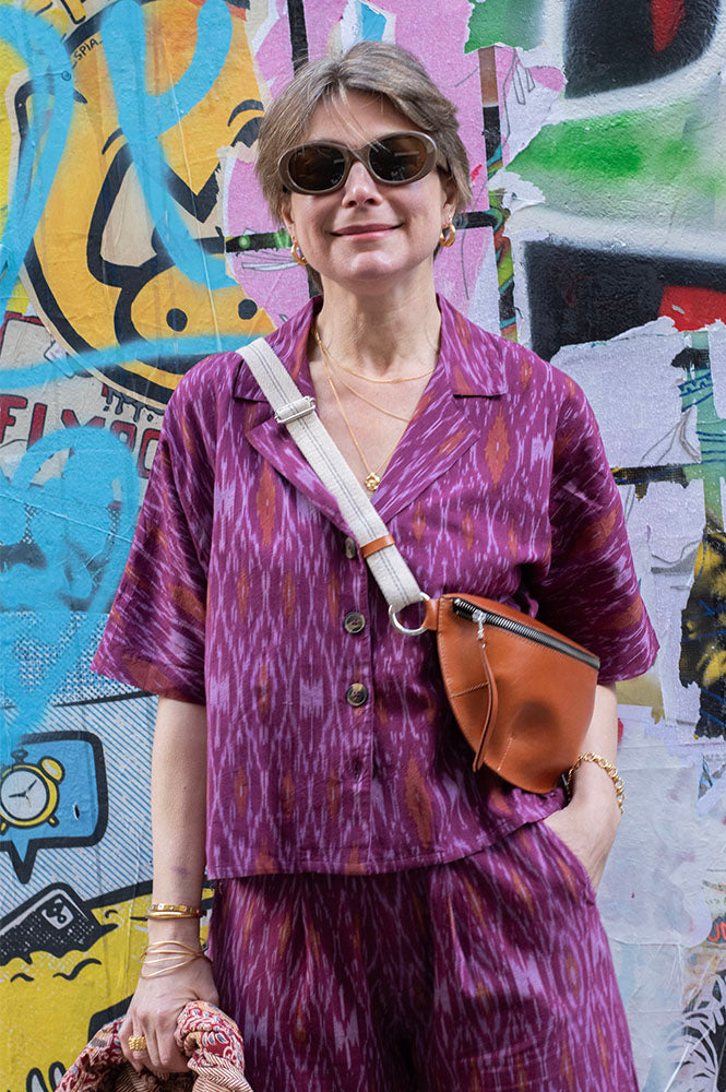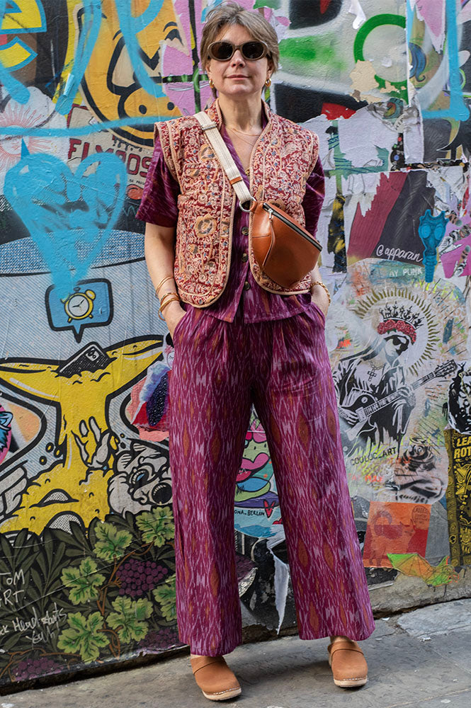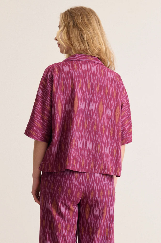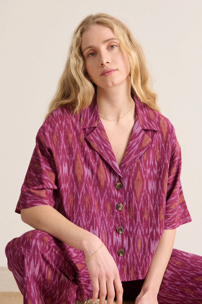 VERDIN, the blouse that redefines casual elegance. Designed with a pajama collar, it combines comfort and refinement, while its garnet color and ikat fabric add a touch of unique character. Ideal for a chic and easy-to-wear look, Verdin adapts to all your occasions. Looks great by itself or with the matching trousers.