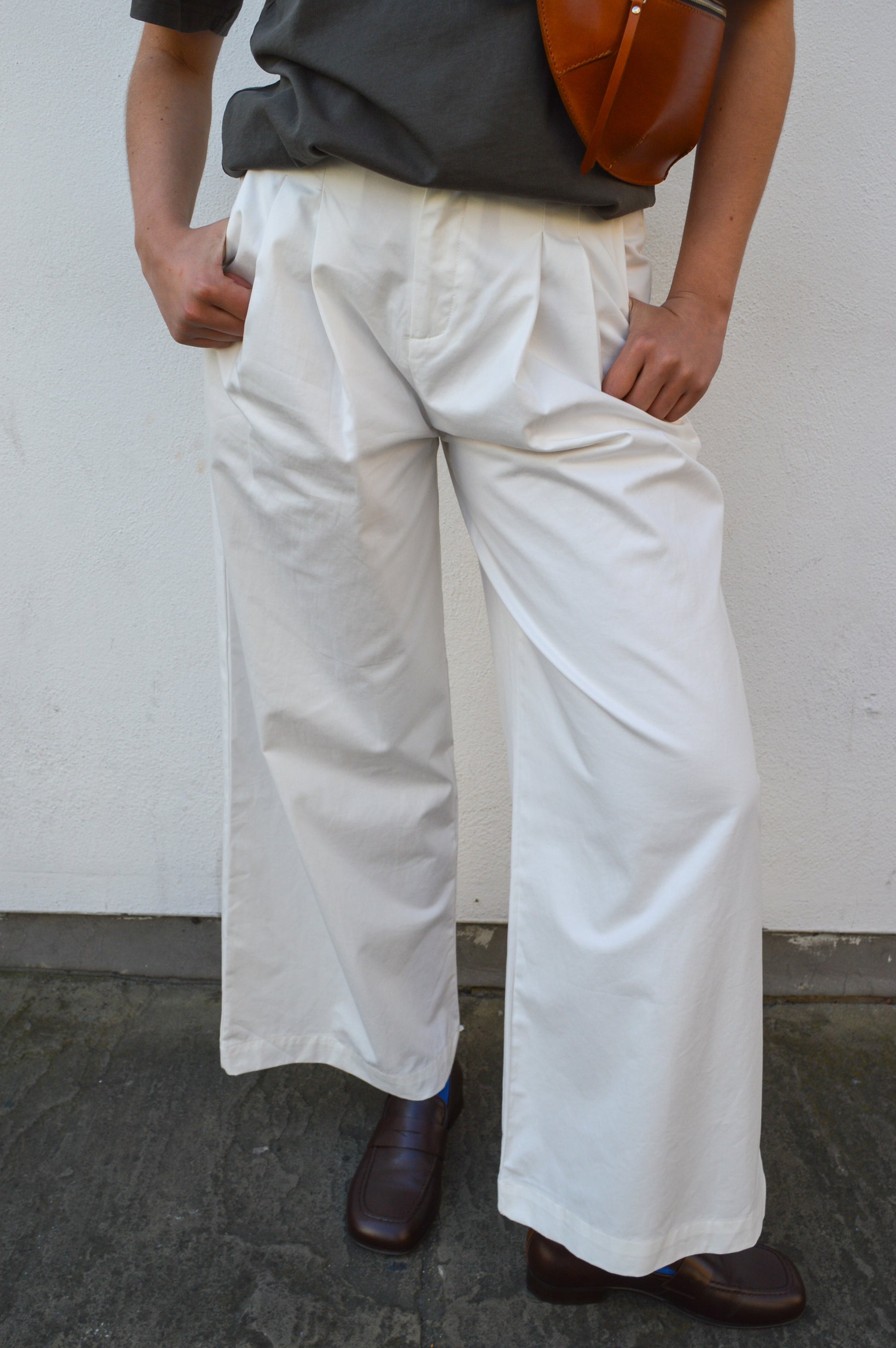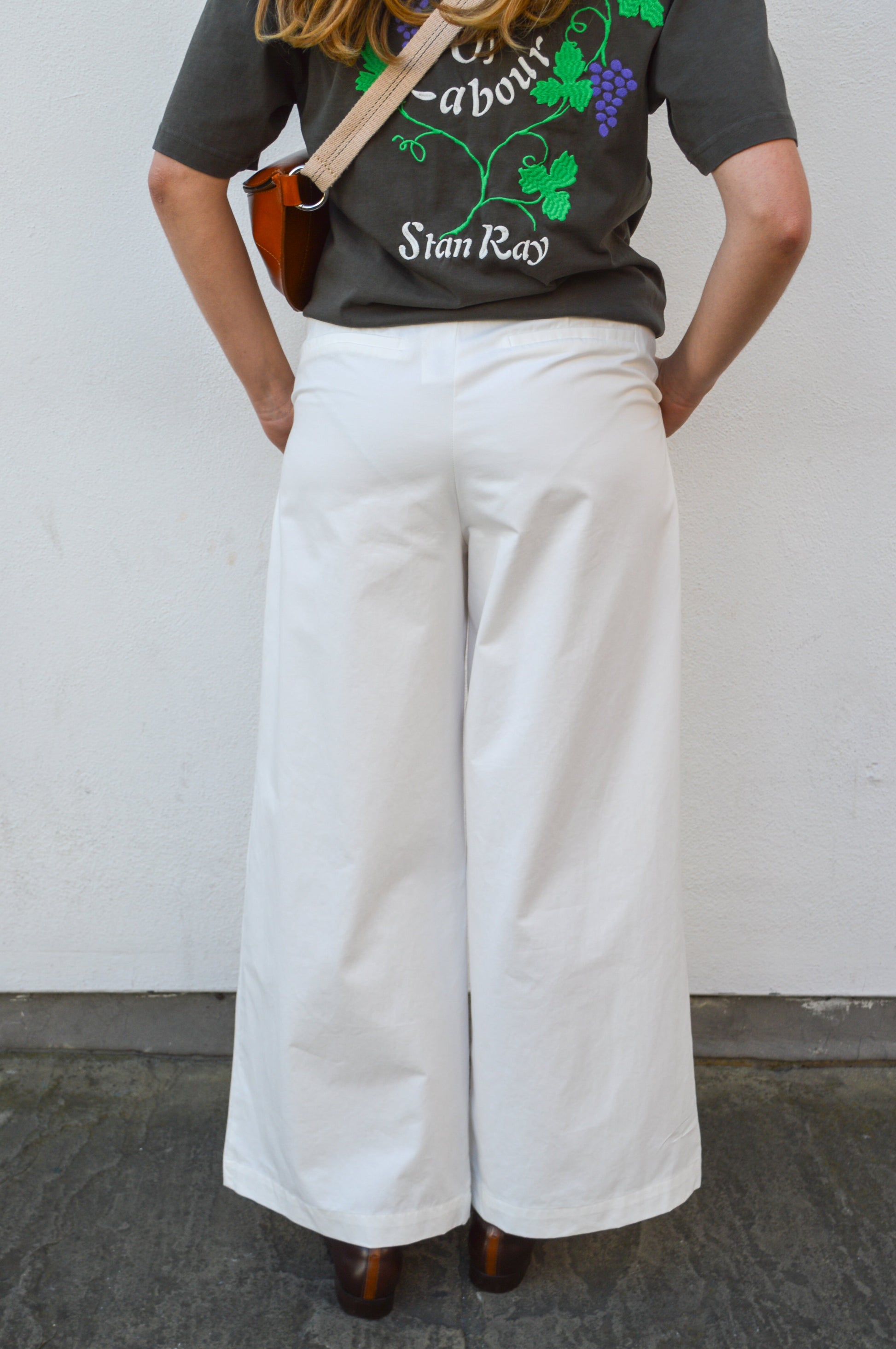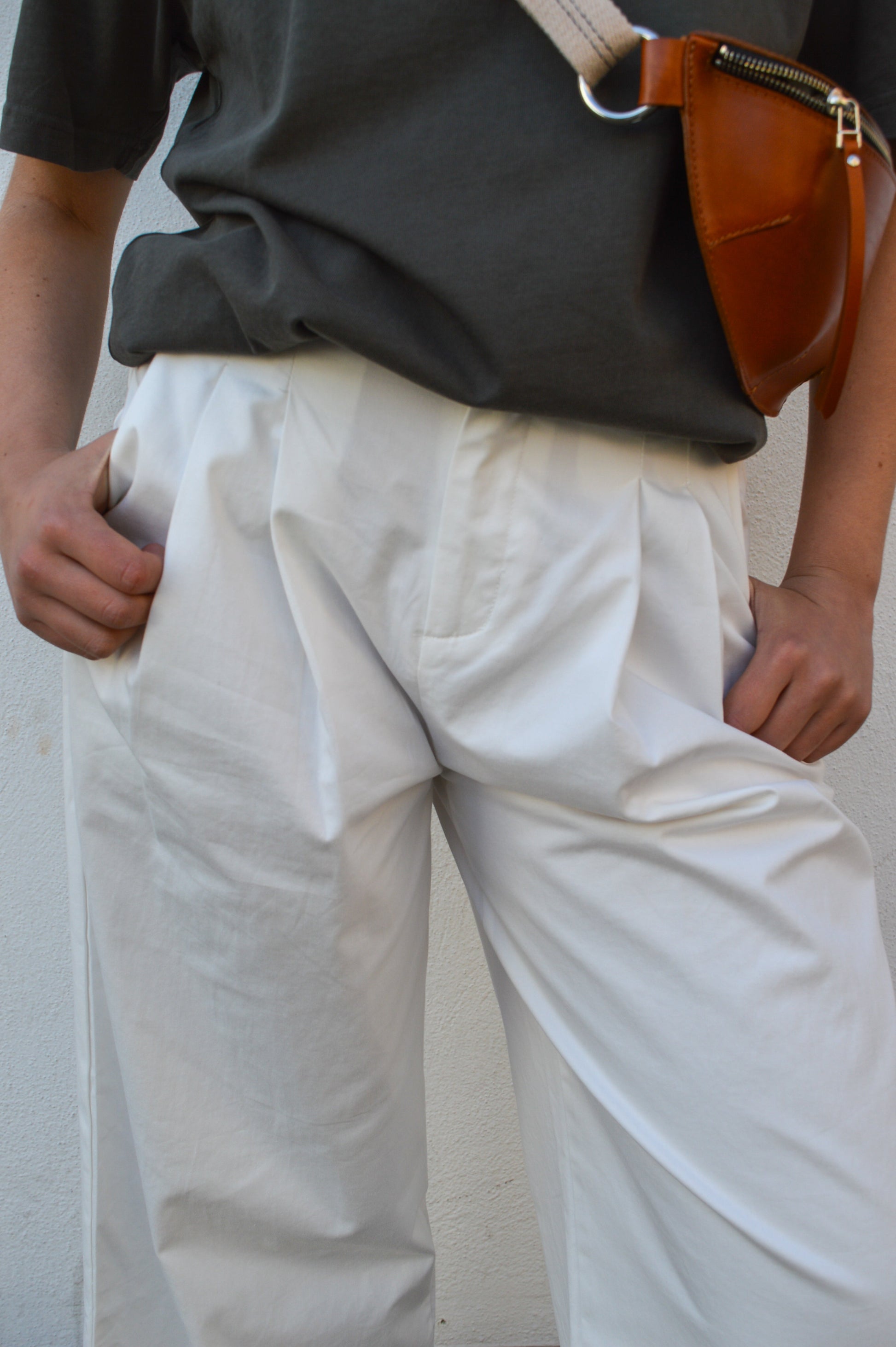 Perfect wide leg trousers from Garance in ecru. Pleated detail at the front for shape and classic zip fly fastening with button on waistband. Has pockets, and is a great trouser to wear everyday or for a smarter occasion.