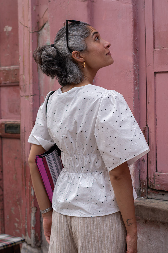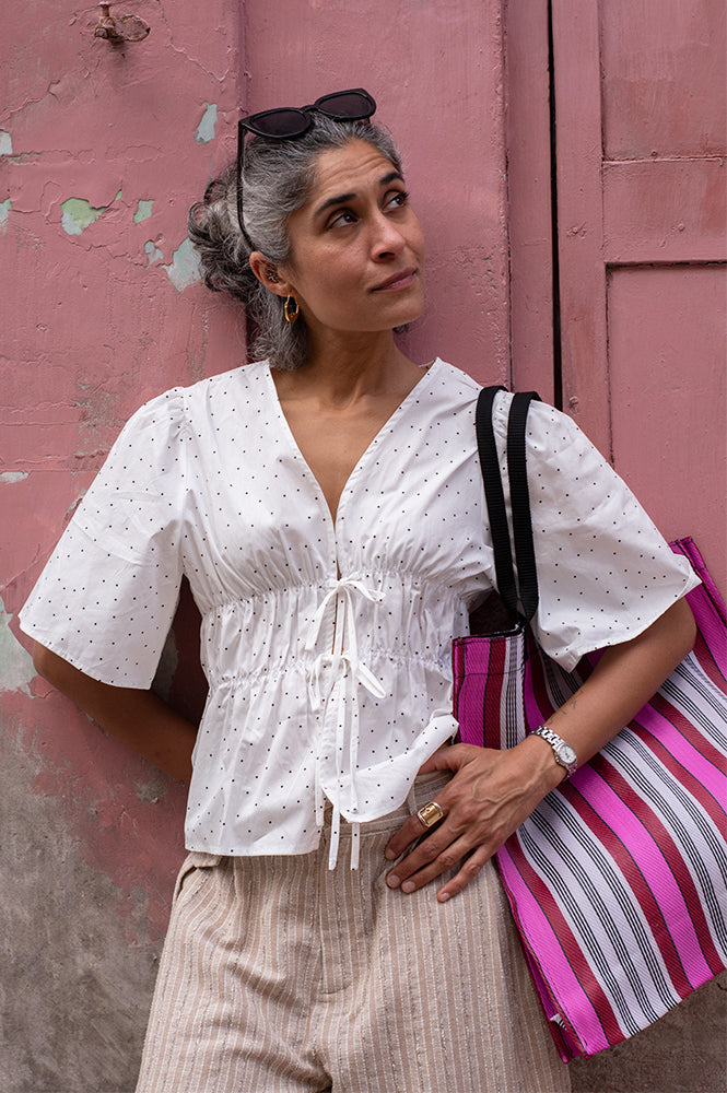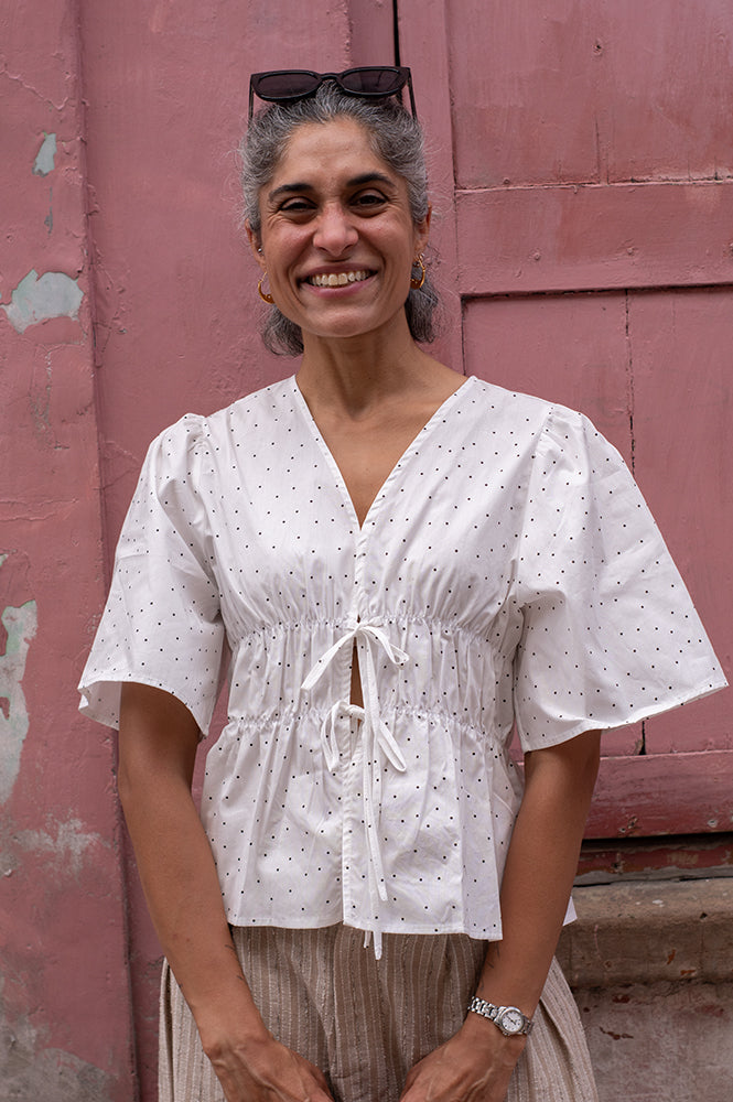 This gorgeous blouse features a delicate polkadot print across, short sleeves and a double bow at the front with ruching along the side of the blouse for a more fitted look. Dress this piece effortlessly up or down and is a great piece, not just for in warmer weather but also to layer with in cooler weathers.