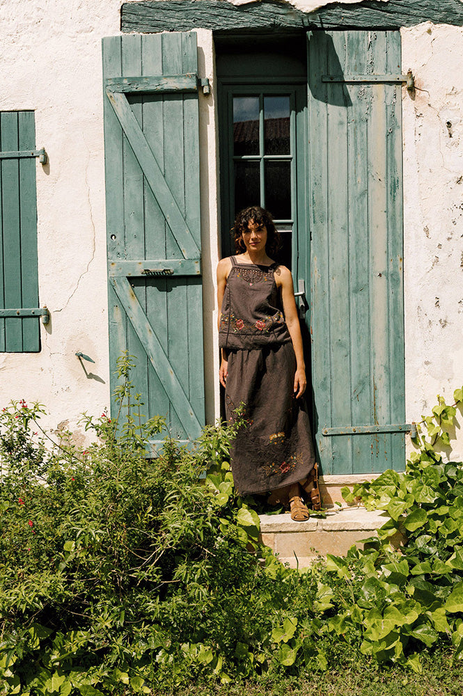 An a-line pinch of summer sweetness, cross-stitch roses so delicate you can almost smell them, the square neckline and wider straps make not just cute but an easy throw on piece.