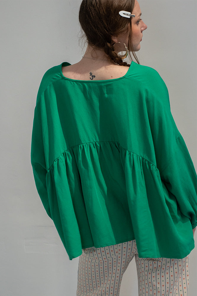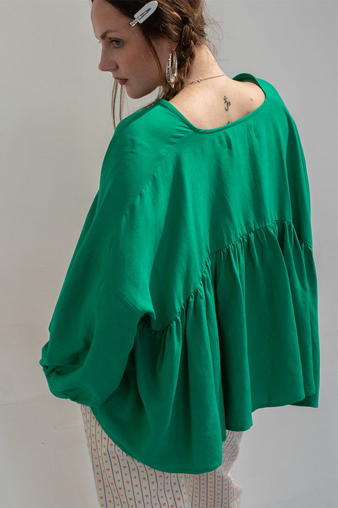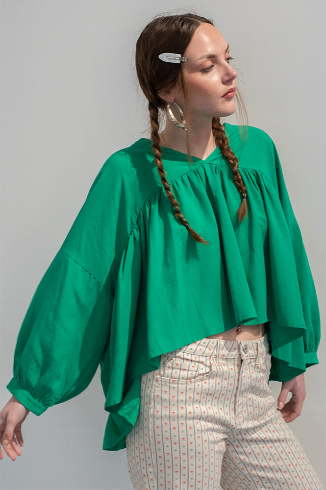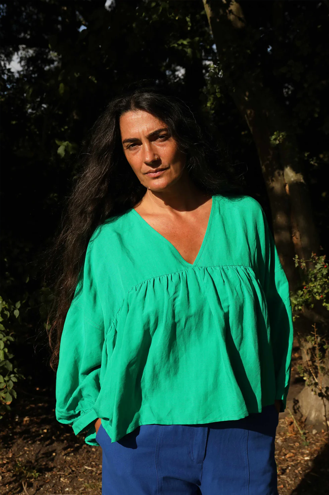The Ballad Top is a voluminous statement top with an easy-wearing silhouette. It has a V-neckline, gathered 3/4 length sleeves, and a gathered bust adding to the voluminous shape. Crafted from a textured linen viscose blend in a vibrant grass green.
