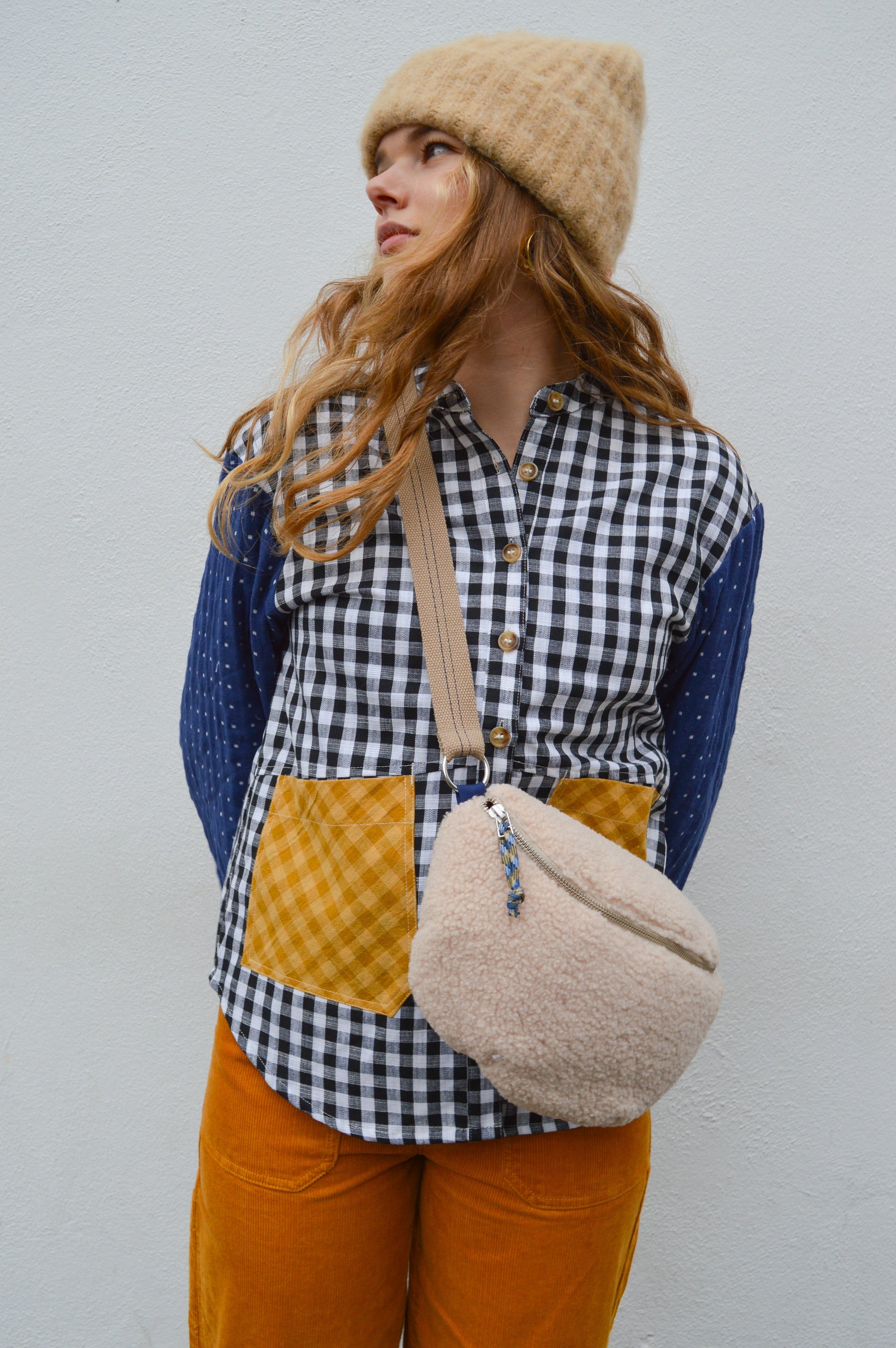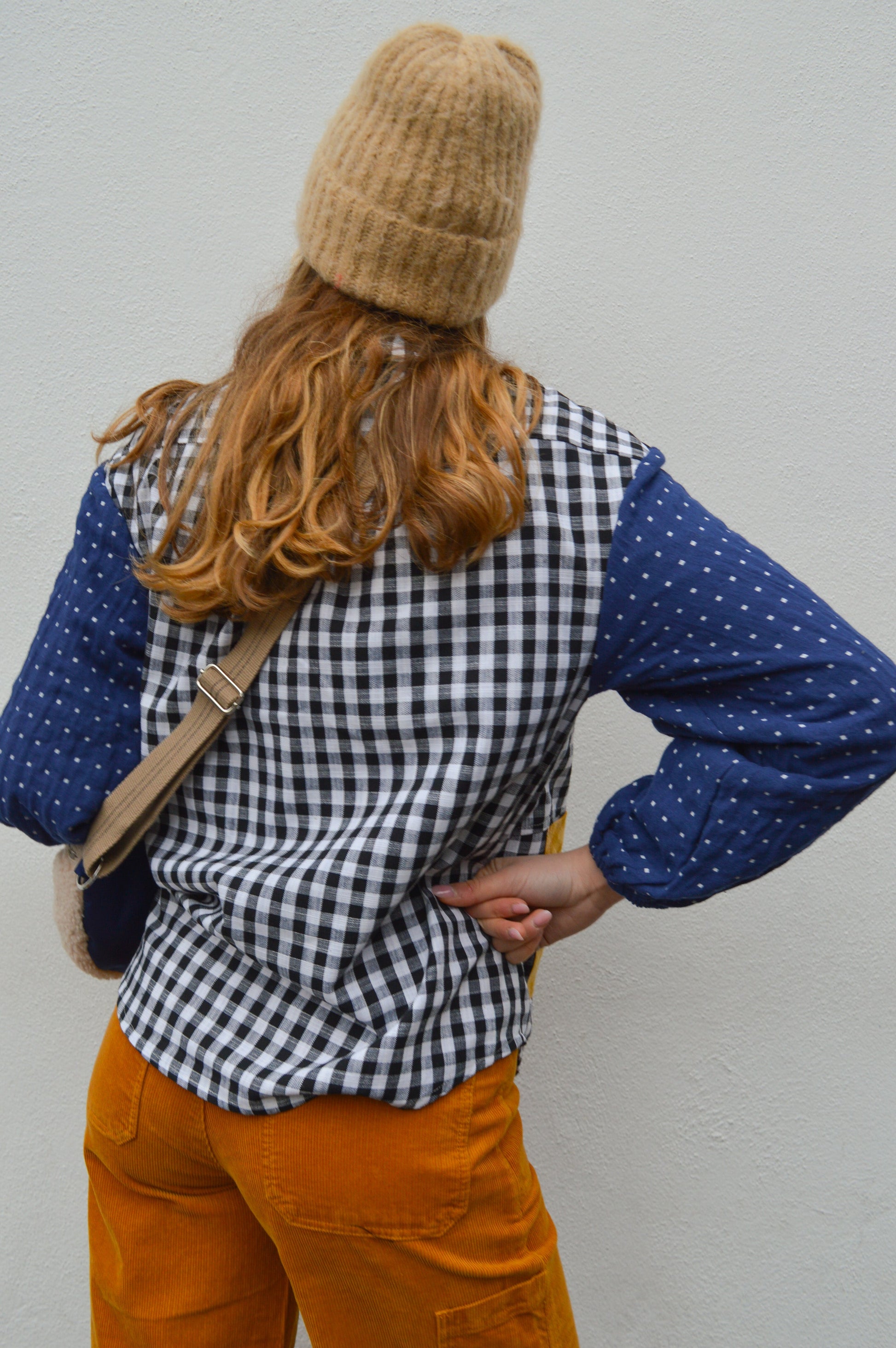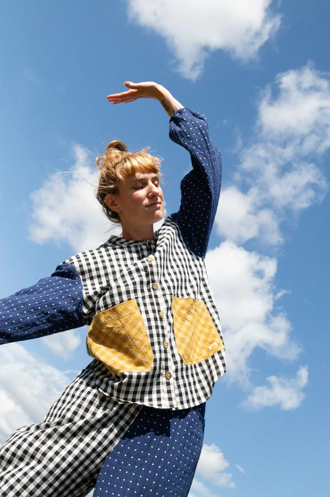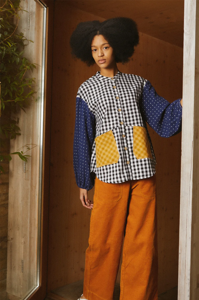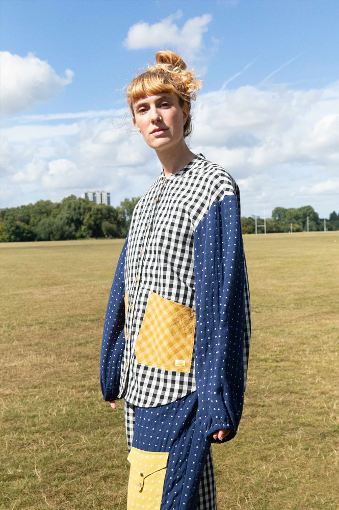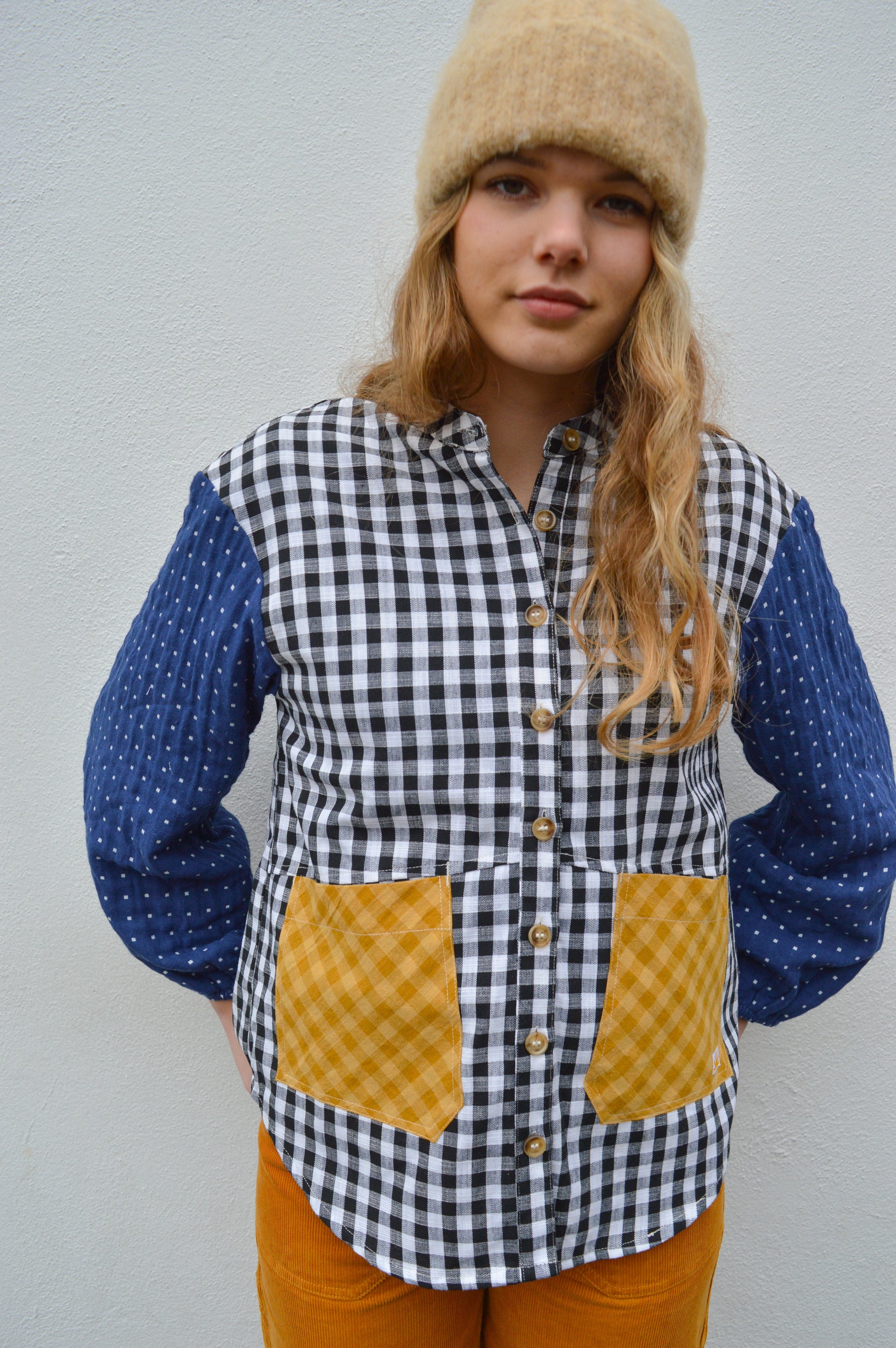 The Gale Shirt has a straight cut, long sleeves and a curved hem. With angled front patch pockets and our mini sun woven patch logo. Crafted from a playful patchwork of various textural check and gingham fabrics.