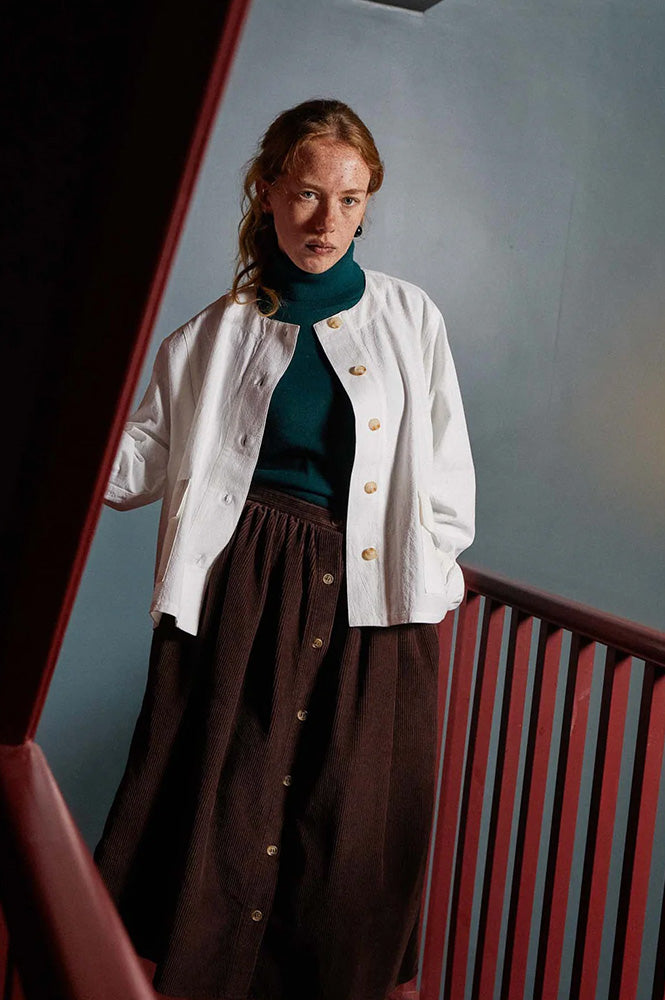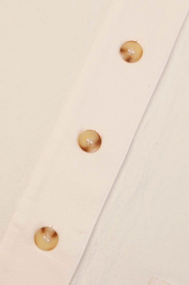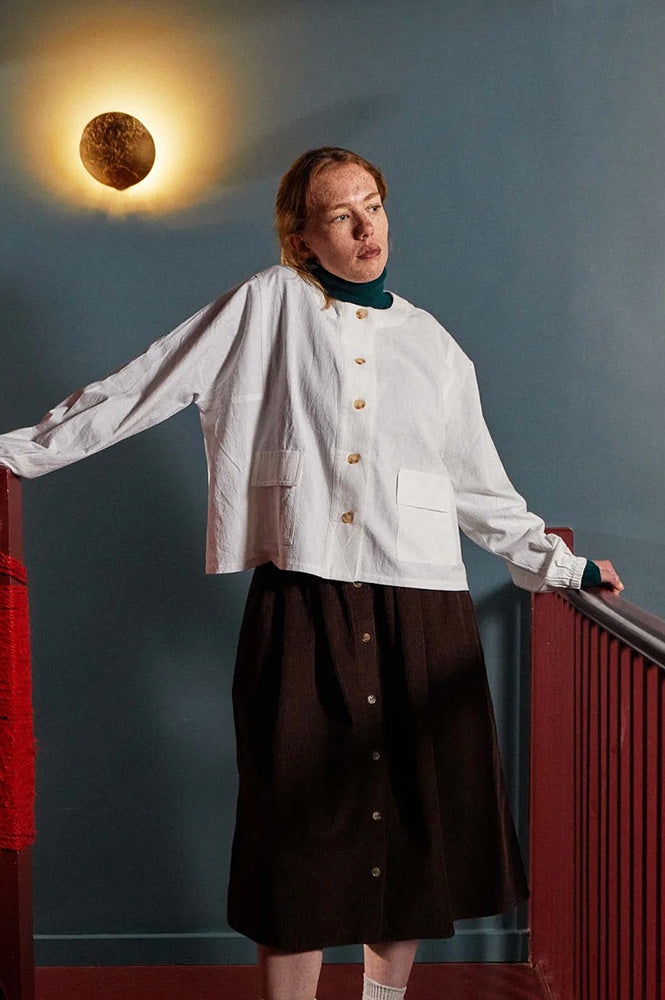 The Noel Top is an easy-wearing top made in a cotton crepe that brings a subtle texture. A collarless style with a boxy square silhouette, it features patch pockets and contrast horn buttons down the front placket.