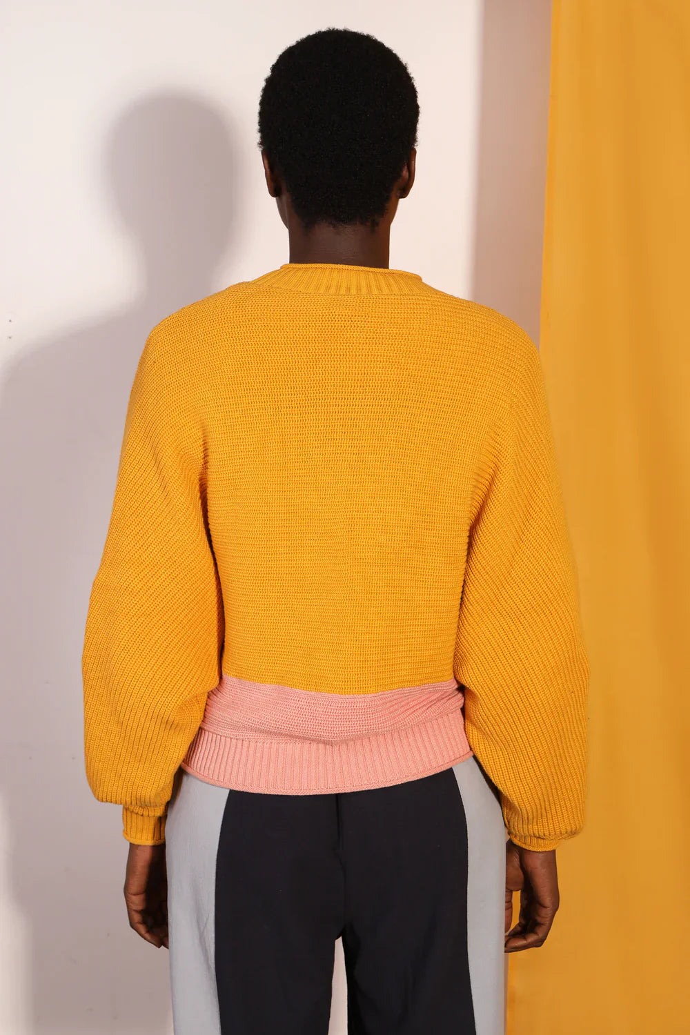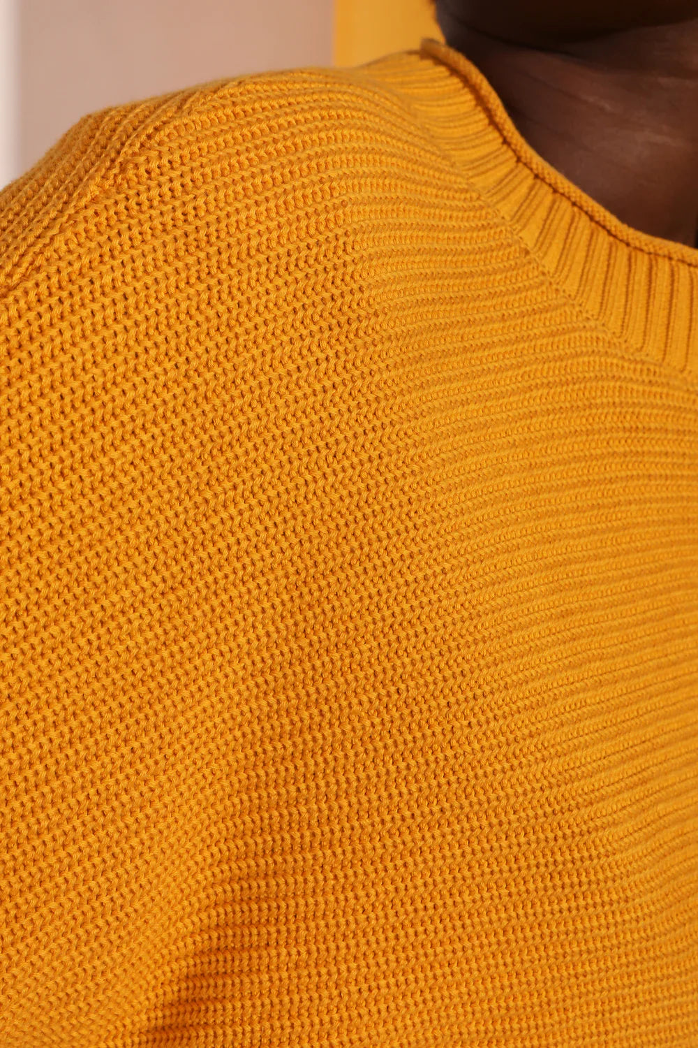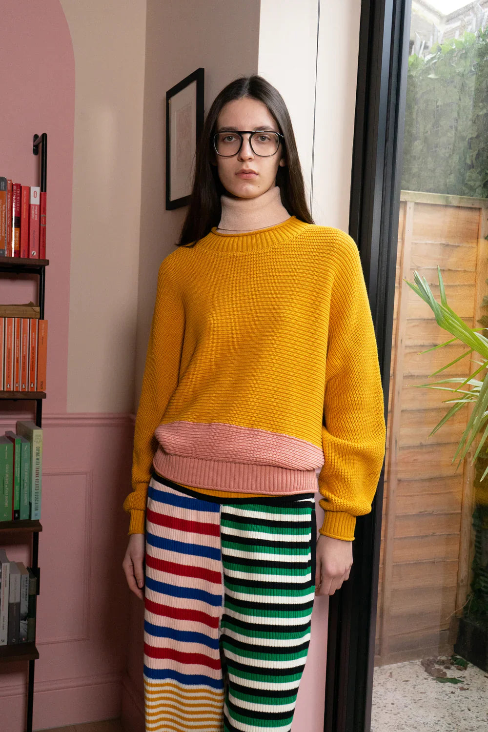 The Vernon Knit has a relaxed silhouette with roomy batwing sleeves. Constructed with a textural horizontal rib stitch in a patchwork colour palette and finished with contrasting rolled edges.