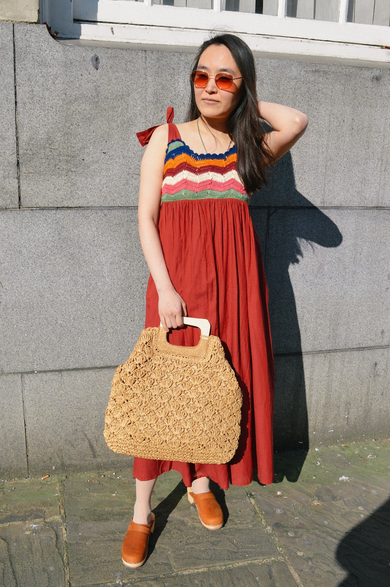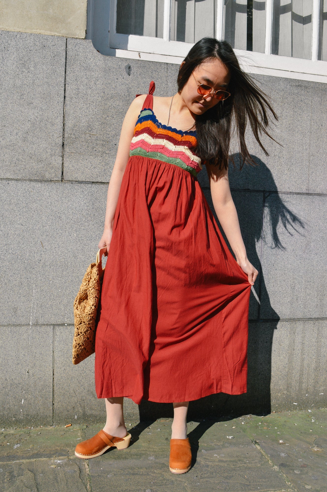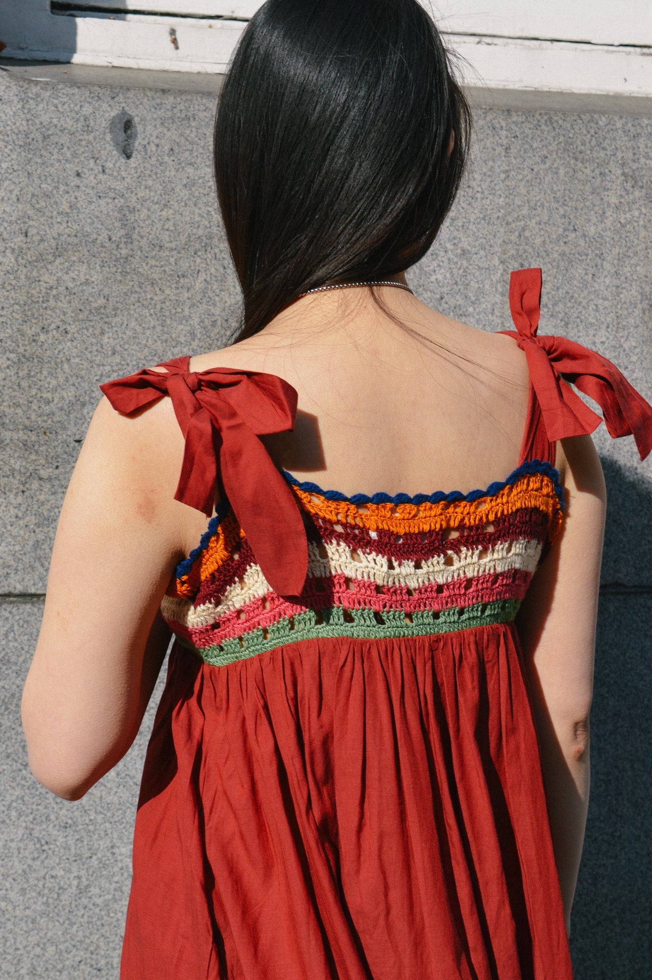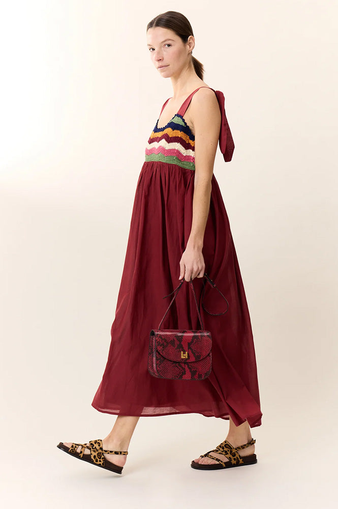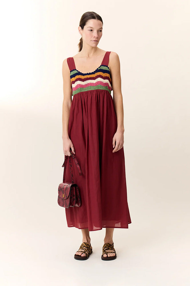 The Ricq Crochet dress is distinguished by its material game with its handmade hook plastron and cotton veil.