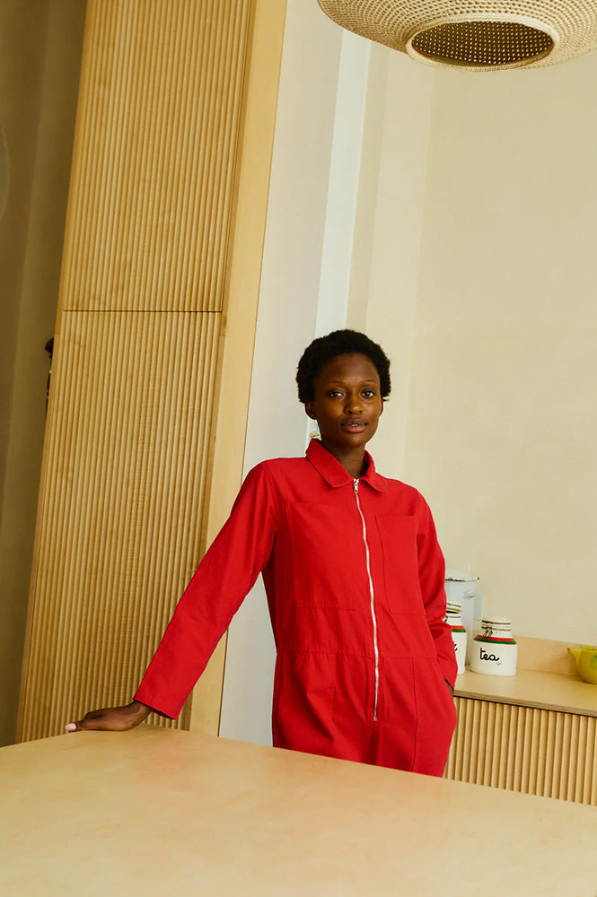 The Dominic Boilersuit has a relaxed fit and a slightly tapered leg, with 3/4 length sleeves. In a vibrant spice red non-stretch cotton canvas, with large utility style pockets and a silver front zip.
