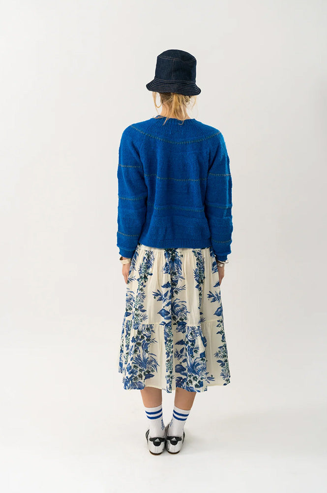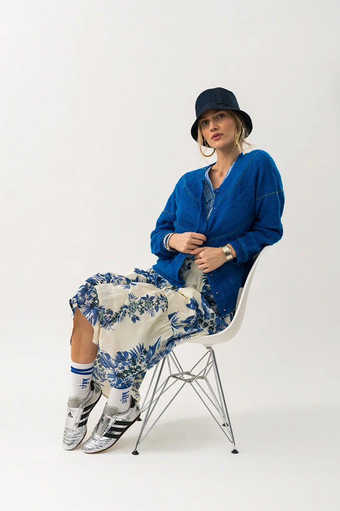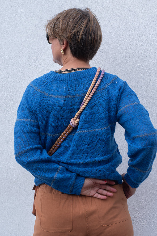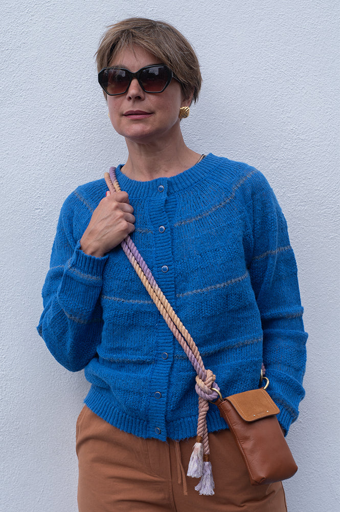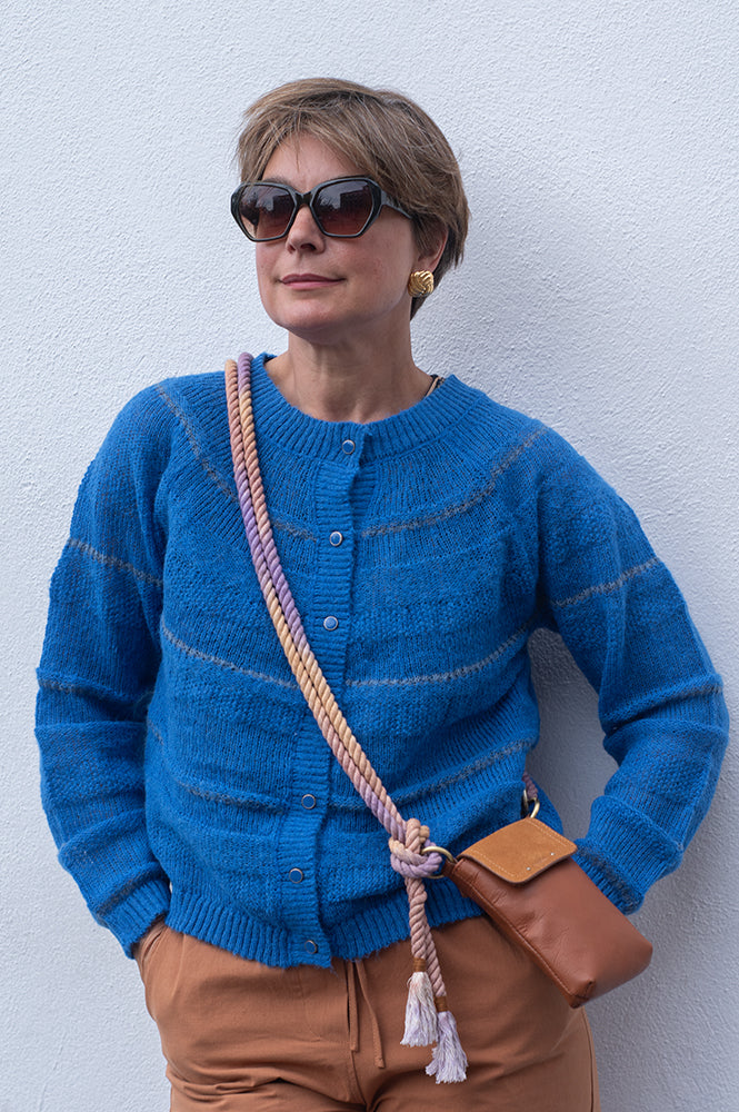 Jork cardigan is a simple knit with a modern twist. Subtle horizontal grey stripes add an elegant touch to the classic cardigan shape. It features a light structure and a flattering fit with raglan sleeves and ribbed edges.