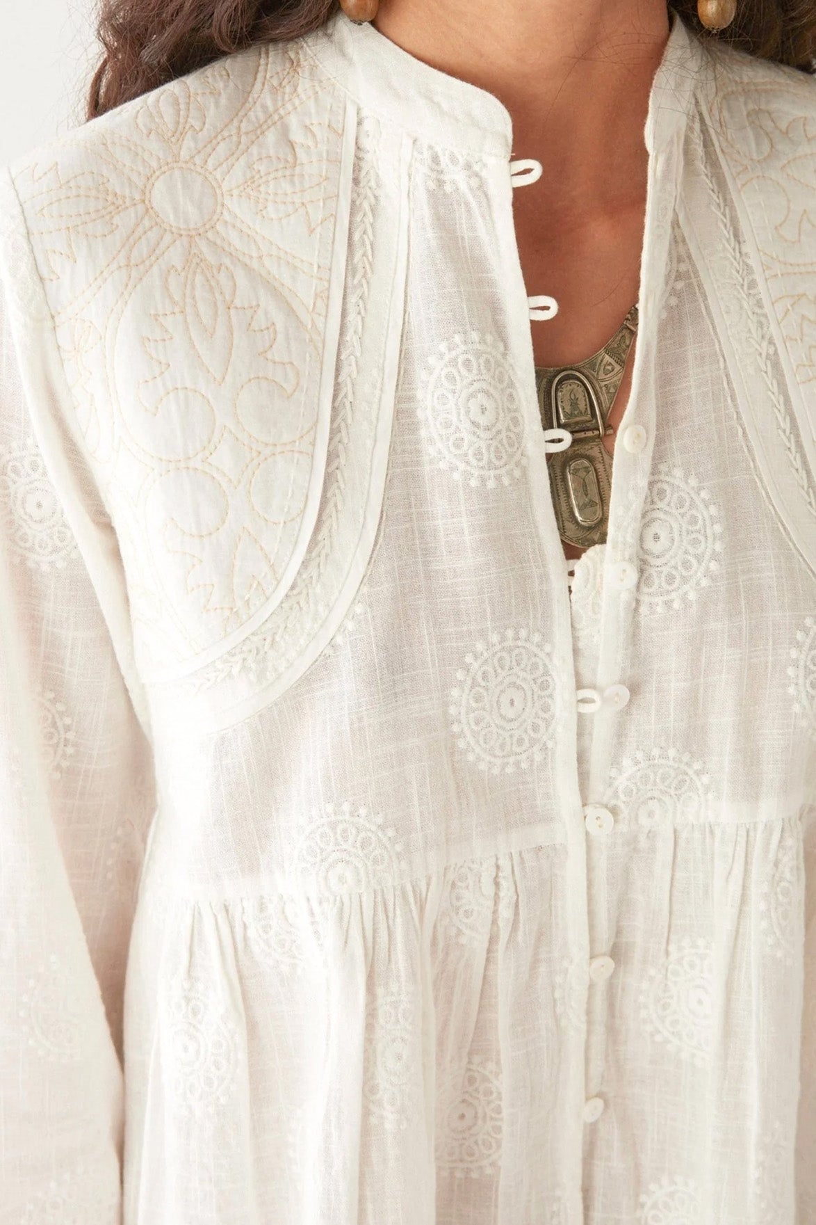 Crafted from cotton voile, the Ariana Blouse is a study in refined texture and effortless movement. Its airy silhouette is punctuated by delicate circular embroidery, adding a tactile dimension to the semi-sheer fabric.