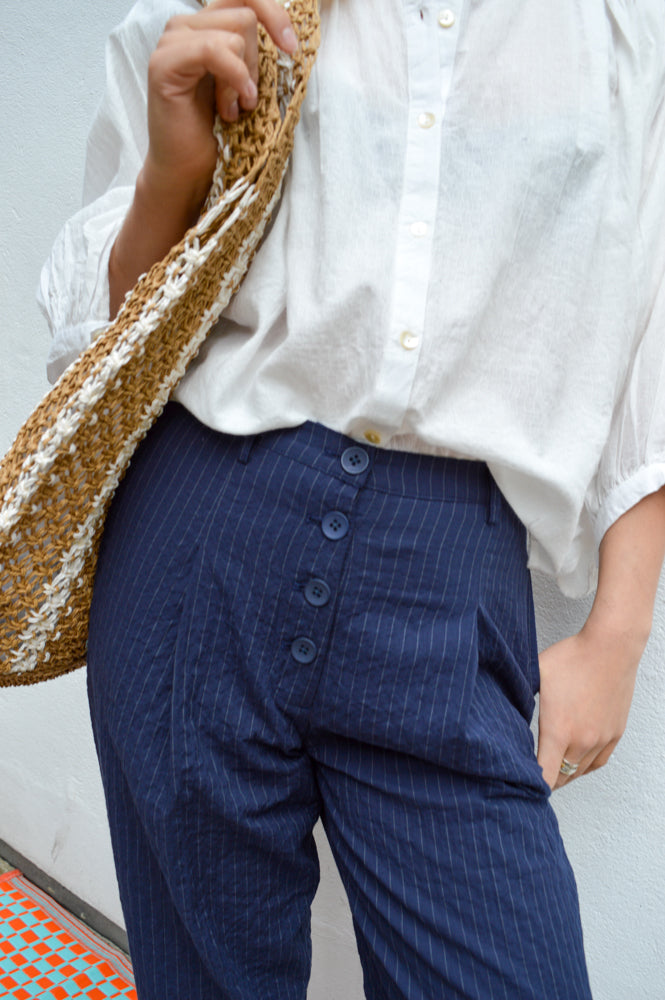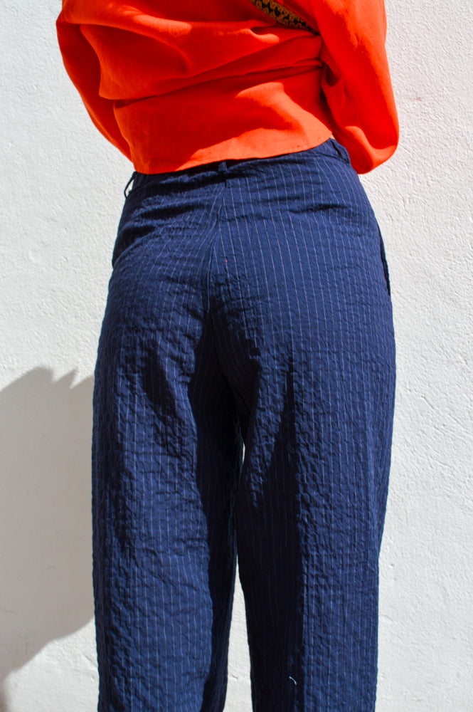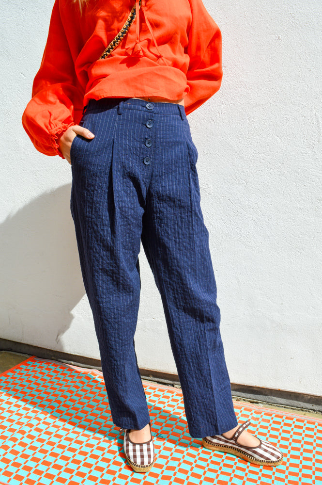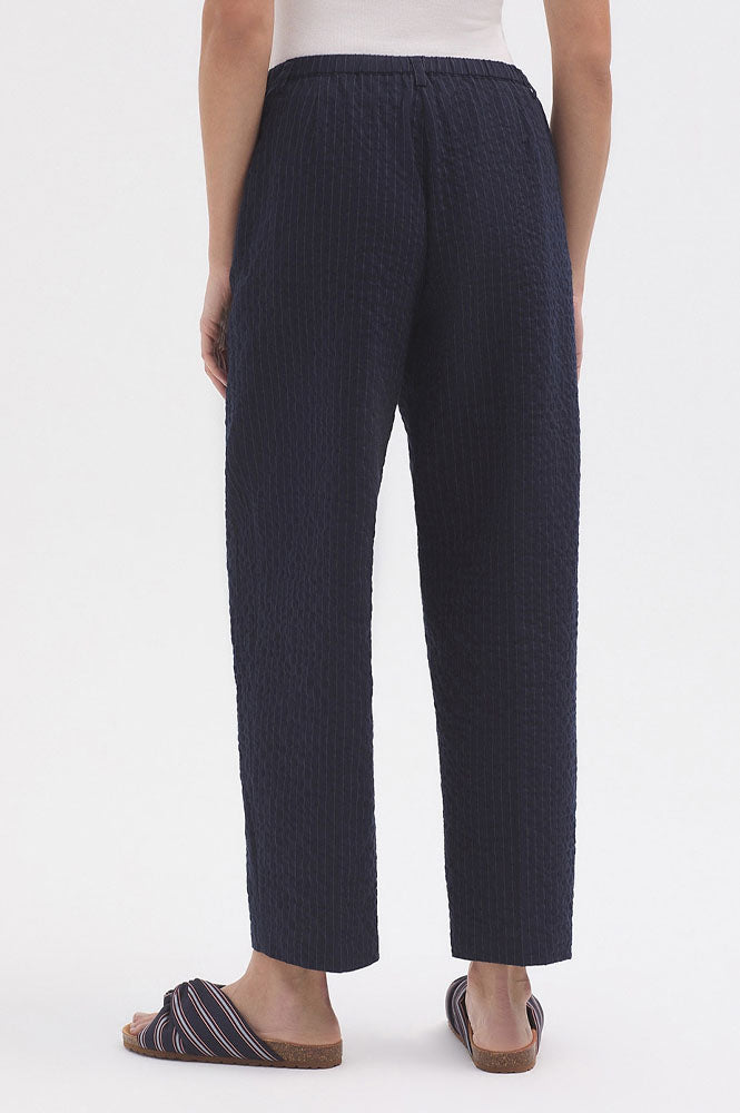 Crinkle effect pinstripe trousers. Exposed button fastening. Pleats and side pockets. Belt loops and concealed elasticated back. Ironed-in crease.