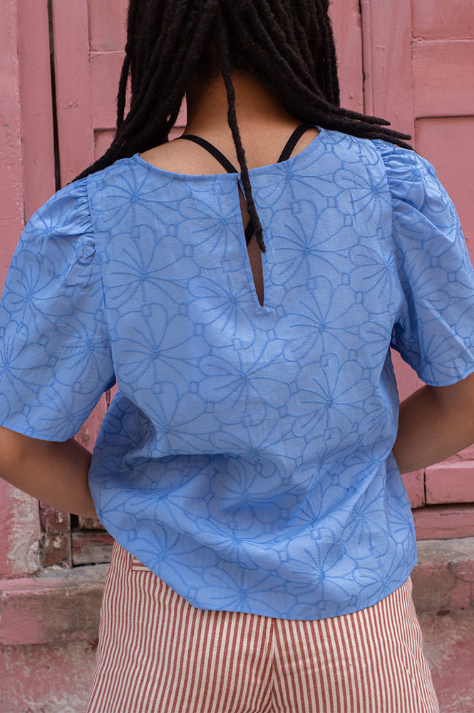 This Object Jilly Cornflower Blue Top features a slight puff shoulder and delicate floral embroidery. Elevate your everyday style with this chic and feminine top.