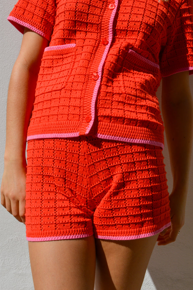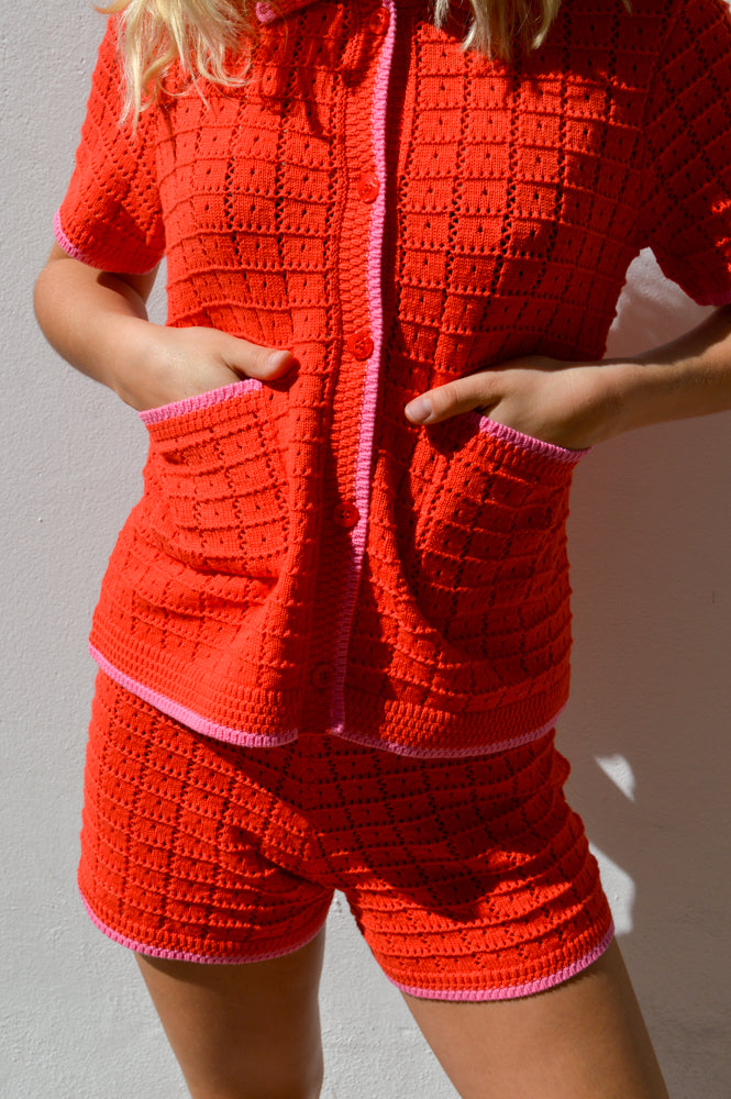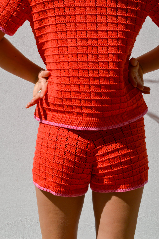 Knitted in a delicate pattern, these strawberry red knitted polo shorts from Petite Mendigote are a great addition to your summer wardrobe. The waistband has complimentary pink stripes running horizontally across, and has thick and supportive elastic running through to give you the correct and comfortable fit. Pair with a basic t-shirt or with the matching Mino shirt.