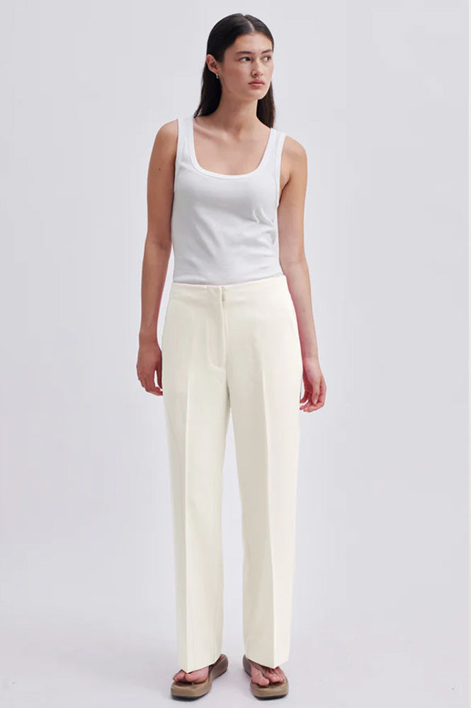 In a straight leg fit, the Evie Trousers from Second Female feature a wide waistband and a crease line.