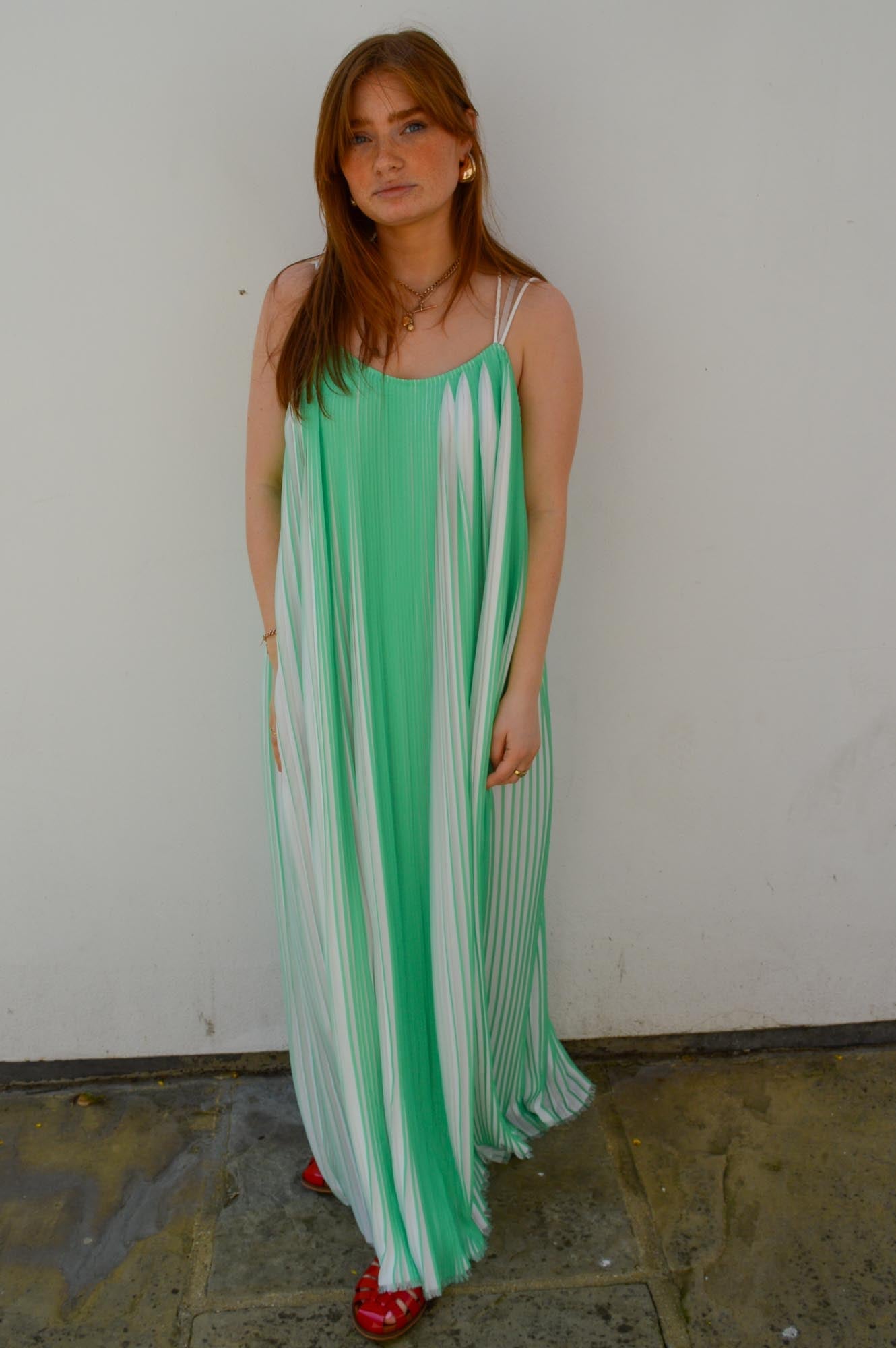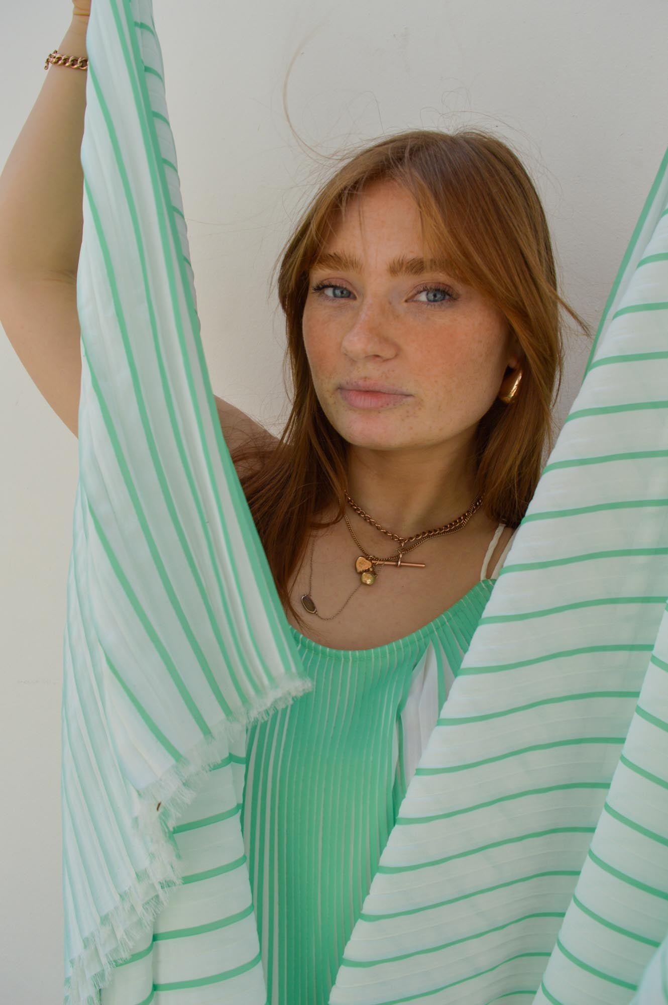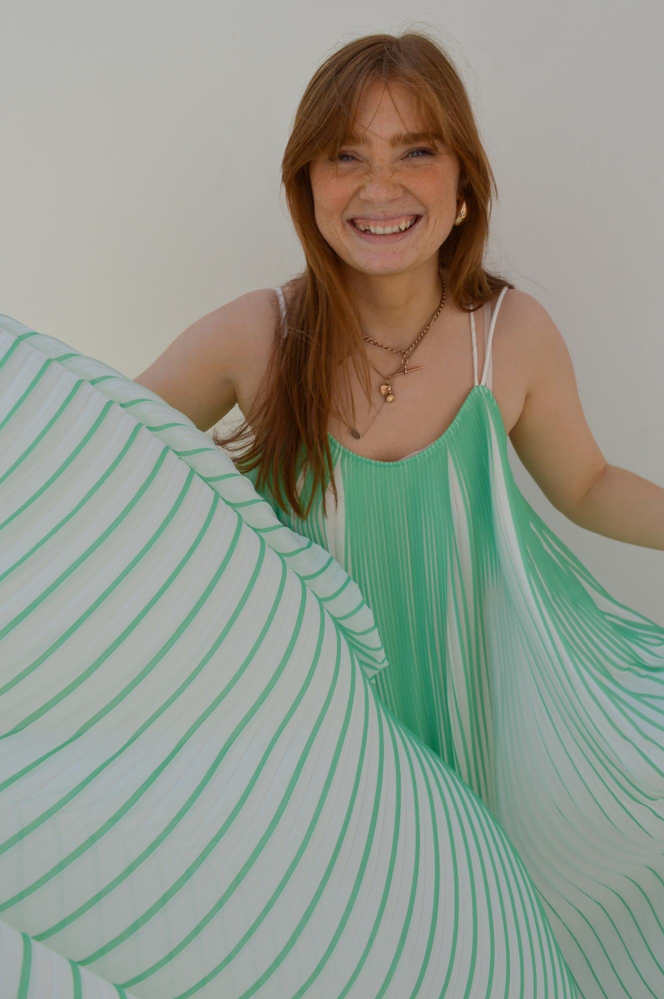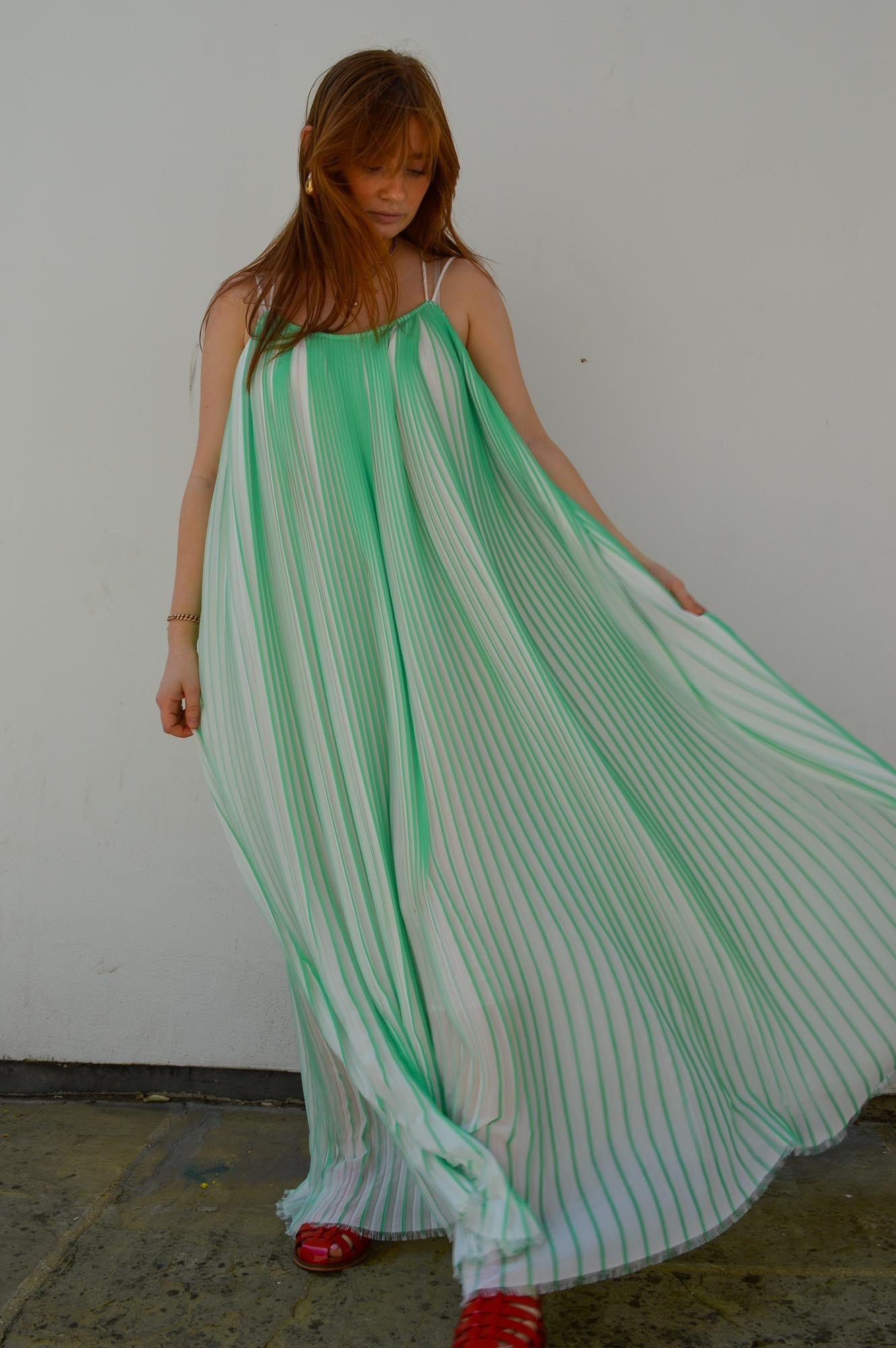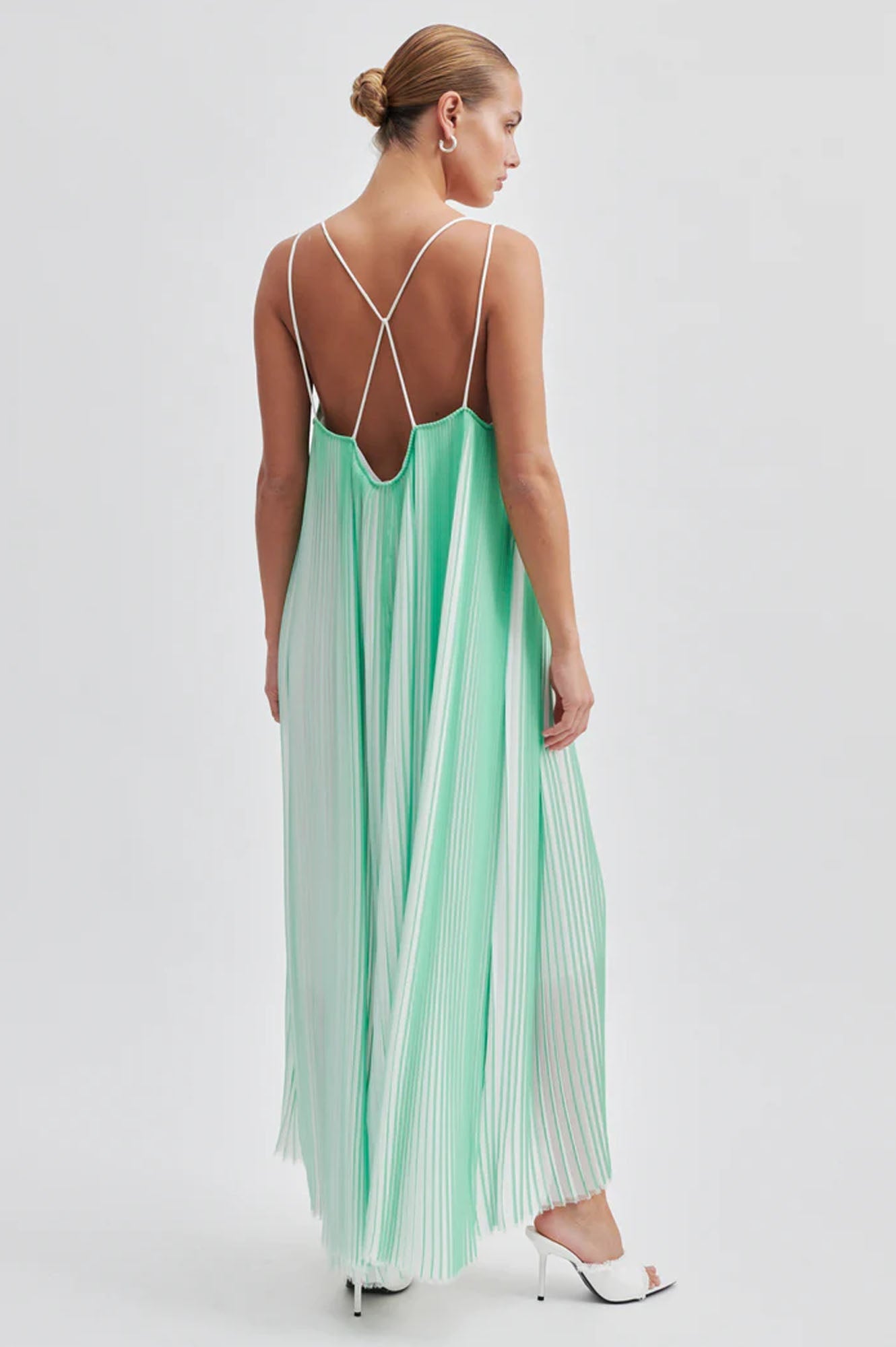 Second Female two-tone plissé dress. Made in light and airy plissé with two-tone effect. Featuring double shoulder straps that cross over at the back. Loose fit with volume that creates a swingy silhouette.