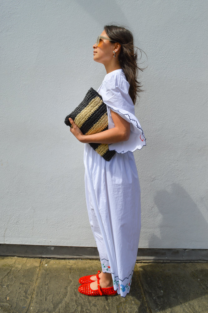 A dress to carry you through spring summer and autumn, stay warm by layering it up or head out as is, an entire fabulous outfit in one piece! With it's delicate folk inspired embroidery, scalloped edges and airy design, this is a dress you'll reach for for years to come.
