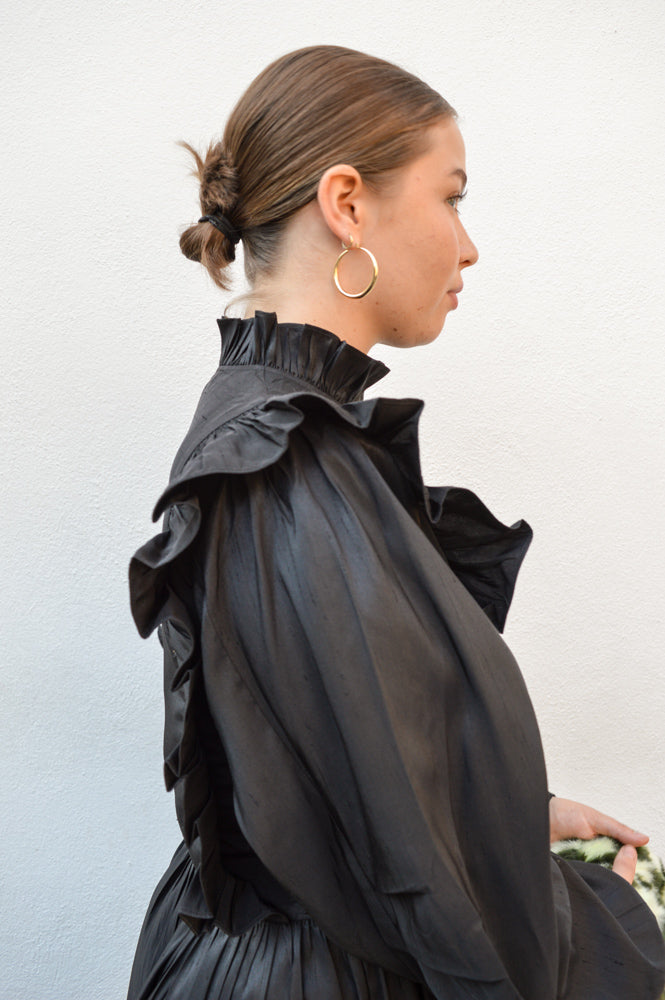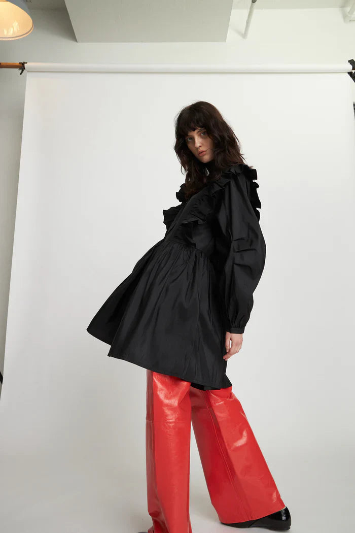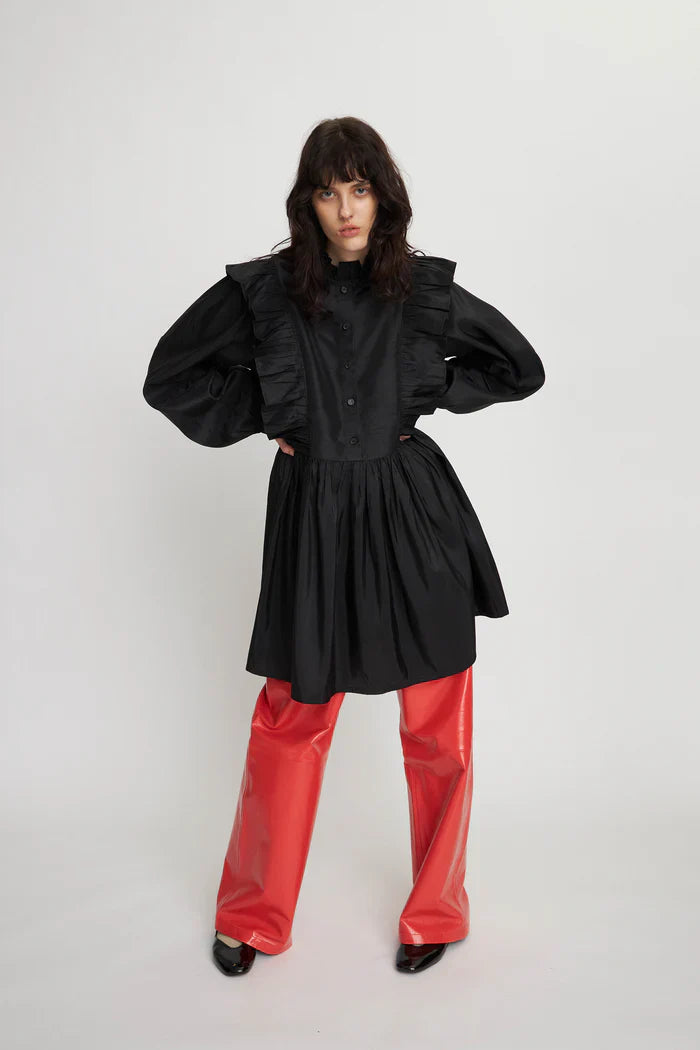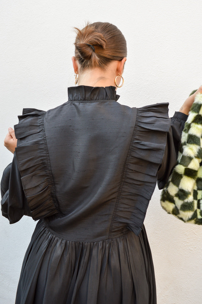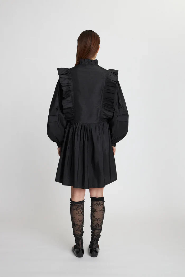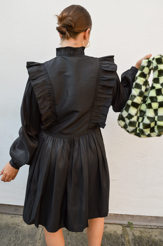 Short dress in a crispy material with ruffles on the chest and around the back. Long sleeves and cuffs closed with a single button. The dress has a high neck with ruffles and buttons centerfront. The skirt has a slight volume. Loose fit.