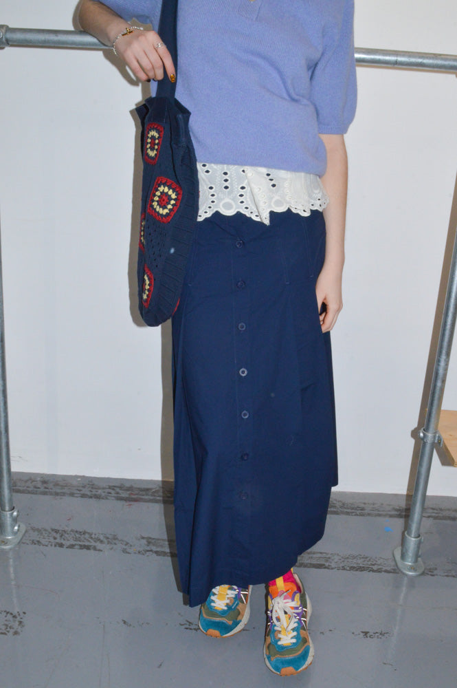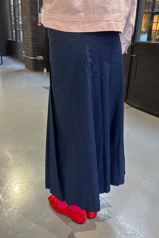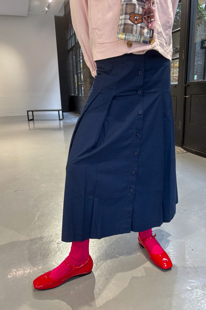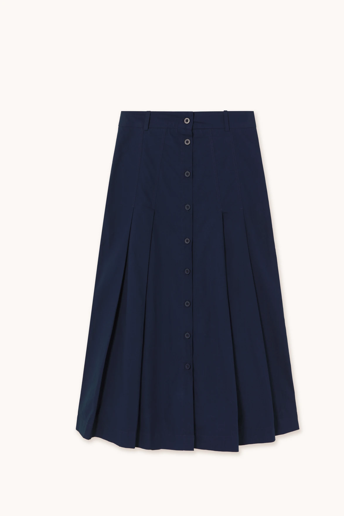 Crafted from cotton poplin, this pleated midi skirt features a front button opening. The navy base adds a classic, sophisticated feel. Style it with the matching top for a complete look.