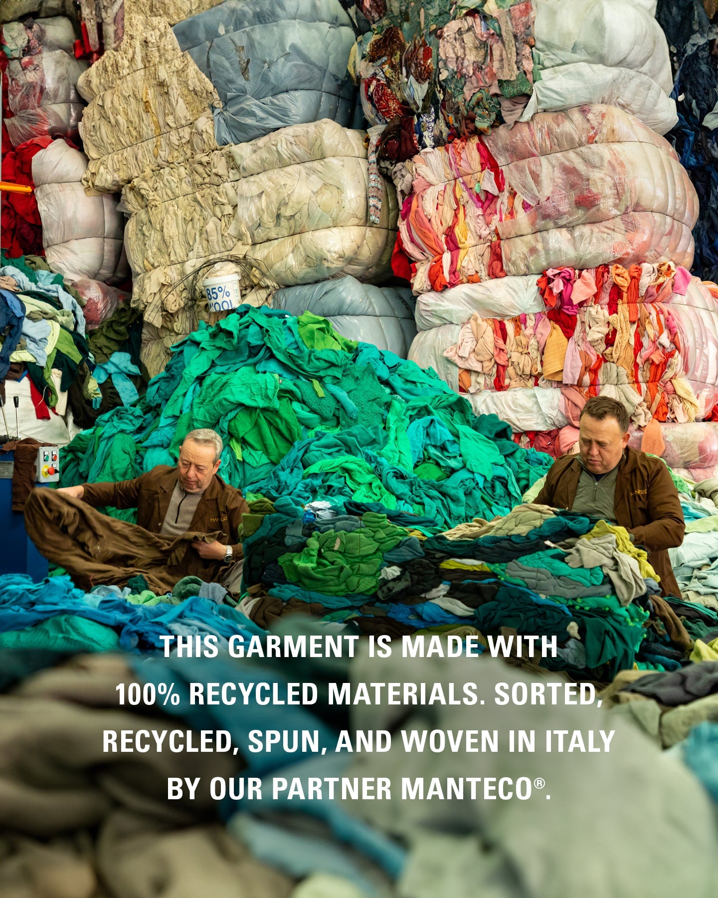 Sorted, recycled, spun, and woven in Italy, our partner Manteco created a plush fabric that is made completely of recycled wool, helping to divert pre and post consumer virgin wool textiles from landfills and putting this valuable fiber back into circulation.